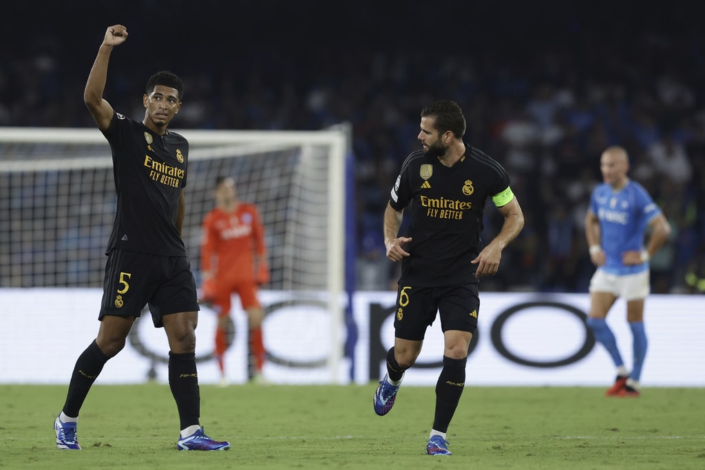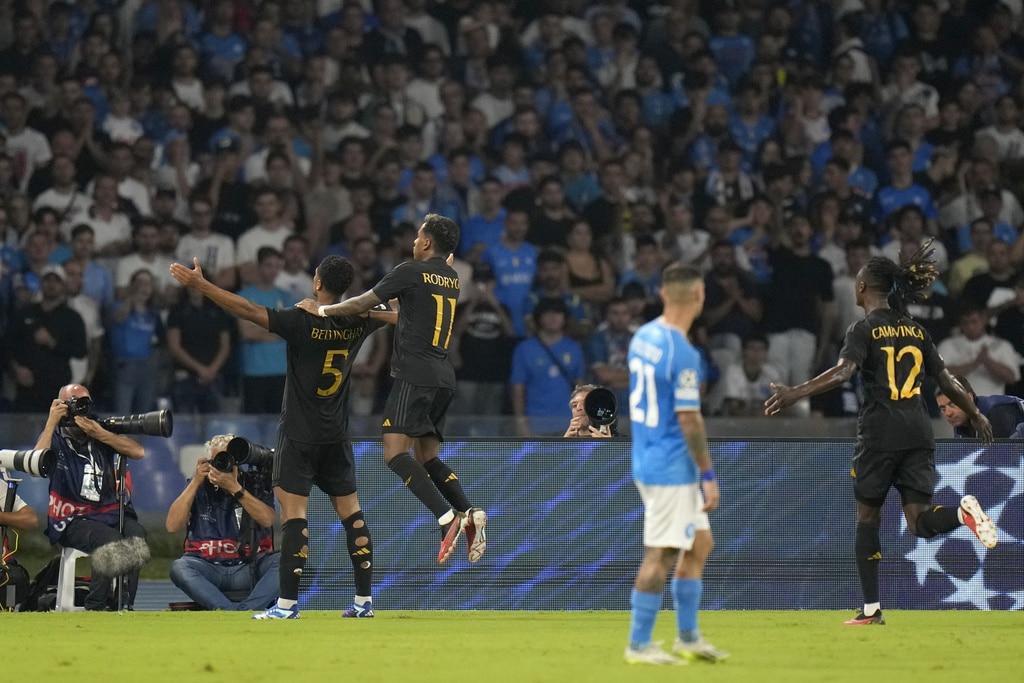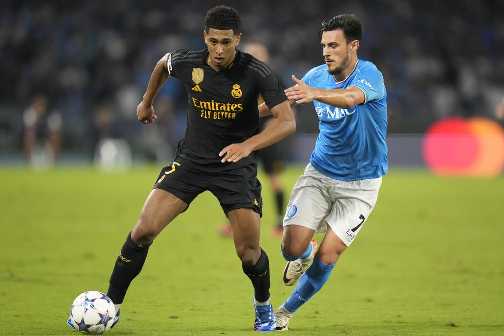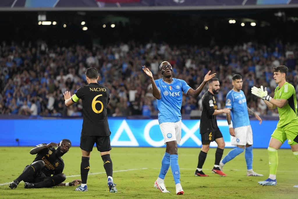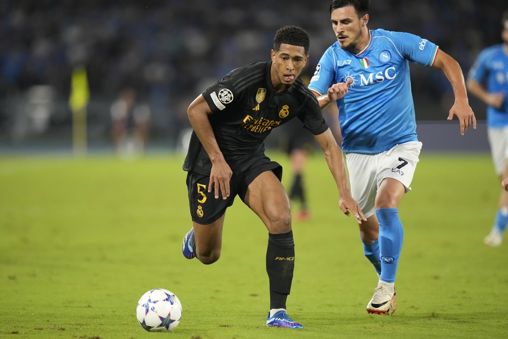 Napoli’s Elif Elmas, right, challenges Real Madrid’s Jude Bellingham during the Champions League group C soccer match between Napoli and Real Madrid at the Diego Armando Maradona stadium in Naples, Italy, Tuesday, Oct. 3, 2023. (AP Photo/Alessandra Tarantino)Napoli’s Giovanni Di Lorenzo, right, and Napoli’s Leo Ostigard, left, challenge Real Madrid’s Joselu, back, during the Champions League group C soccer match between Napoli and Real Madrid at the Diego Armando Maradona stadium in Naples, Italy, Tuesday, Oct. 3, 2023. (AP Photo/Alessandra Tarantino)Real Madrid’s head coach Carlo Ancelotti gestures during the Champions League group C soccer match between Napoli and Real Madrid at the Diego Armando Maradona stadium in Naples, Italy, Tuesday, Oct. 3, 2023. (AP Photo/Alessandra Tarantino)Real Madrid’s goalkeeper Kepa Arrizabalaga, 2nd right, catches the ball during the Champions League group C soccer match between Napoli and Real Madrid at the Diego Armando Maradona stadium in Naples, Italy, Tuesday, Oct. 3, 2023. (AP Photo/Alessandra Tarantino)Napoli’s Piotr Zielinski, center, celebrates after scoring his sides second goal during the Champions League group C soccer match between Napoli and Real Madrid at the Diego Armando Maradona stadium in Naples, Italy, Tuesday, Oct. 3, 2023. (AP Photo/Alessandra Tarantino)Real Madrid’s Jude Bellingham, left, celebrates after scoring his sides second goal during the Champions League group C soccer match between Napoli and Real Madrid at the Diego Armando Maradona stadium in Naples, Italy, Tuesday, Oct. 3, 2023. (Alessandro Garofalo/LaPresse via AP)Real Madrid’s Jude Bellingham, left, celebrates after scoring his sides second goal during the Champions League group C soccer match between Napoli and Real Madrid at the Diego Armando Maradona stadium in Naples, Italy, Tuesday, Oct. 3, 2023. (Alessandro Garofalo/LaPresse via AP)Napoli’s Victor Osimhen, center, reacts after missing a chance to score during the Champions League group C soccer match between Napoli and Real Madrid at the Diego Armando Maradona stadium in Naples, Italy, Tuesday, Oct. 3, 2023. (AP Photo/Alessandra Tarantino)Napoli’s Leo Ostigard, right, celebrates with teammates after scoring his sides first goal during the Champions League group C soccer match between Napoli and Real Madrid at the Diego Armando Maradona stadium in Naples, Italy, Tuesday, Oct. 3, 2023. (AP Photo/Alessandra Tarantino)Napoli’s Victor Osimhen reacts after missing a chance to score during the Champions League group C soccer match between Napoli and Real Madrid at the Diego Armando Maradona stadium in Naples, Italy, Tuesday, Oct. 3, 2023. (AP Photo/Alessandra Tarantino)Napoli’s Matteo Politano, down, challenges Real Madrid’s Eduardo Camavinga during the Champions League group C soccer match between Napoli and Real Madrid at the Diego Armando Maradona stadium in Naples, Italy, Tuesday, Oct. 3, 2023. (AP Photo/Alessandra Tarantino)Real Madrid’s Jude Bellingham, left, celebrates with teammates after scoring his sides second goal during the Champions League group C soccer match between Napoli and Real Madrid at the Diego Armando Maradona stadium in Naples, Italy, Tuesday, Oct. 3, 2023. (AP Photo/Alessandra Tarantino)Napoli’s Leo Ostigard celebrates after scoring his sides first goal during the Champions League group C soccer match between Napoli and Real Madrid at the Diego Armando Maradona stadium in Naples, Italy, Tuesday, Oct. 3, 2023. (AP Photo/Alessandra Tarantino)Napoli’s Leo Ostigard, 2nd right, scores with a header his sides first goal during the Champions League group C soccer match between Napoli and Real Madrid at the Diego Armando Maradona stadium in Naples, Italy, Tuesday, Oct. 3, 2023. (AP Photo/Alessandra Tarantino)