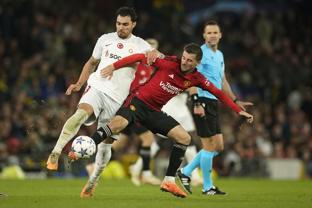 Galatasaray’s Kaan Ayhan, left, challenges for the ball with Manchester United’s Mason Mount during the Champions League group A soccer match between Manchester United and Galatasaray at the Old Trafford stadium in Manchester, England, Tuesday, Oct. 3, 2023. (AP Photo/Dave Thompson)