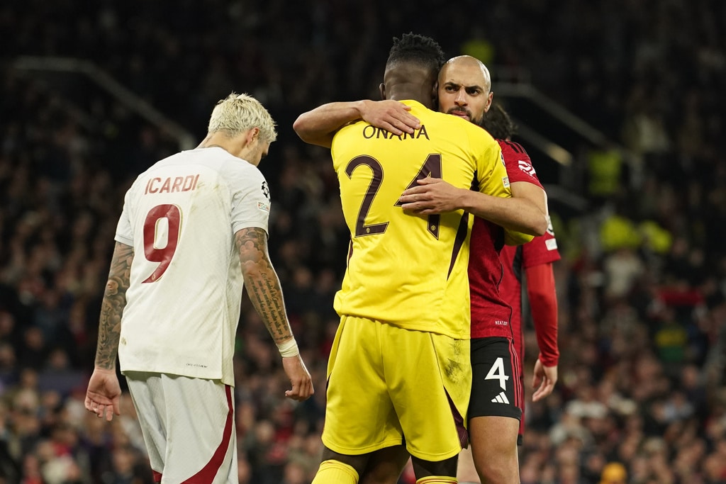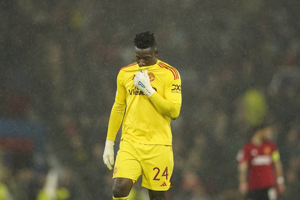 Manchester United’s goalkeeper Andre Onana reacts during the Champions League group A soccer match between Manchester United and Galatasaray at the Old Trafford stadium in Manchester, England, Tuesday, Oct. 3, 2023. (AP Photo/Dave Thompson)