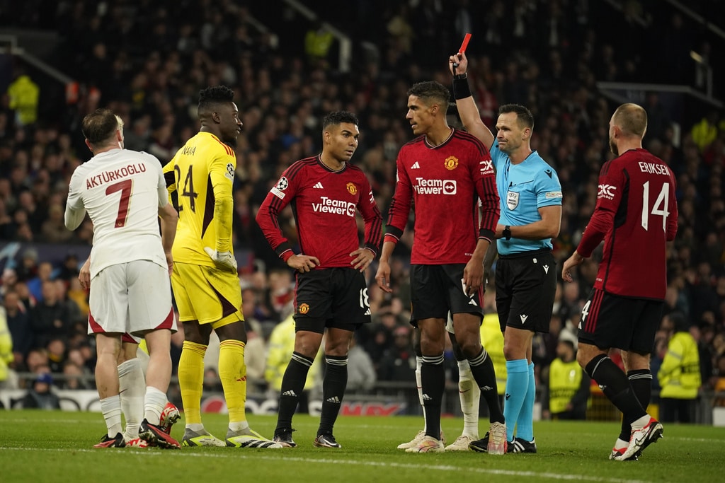 Manchester United’s Casemiro, third from left, receives a red card by a referee during the Champions League group A soccer match between Manchester United and Galatasaray at the Old Trafford stadium in Manchester, England, Tuesday, Oct. 3, 2023. (AP Photo/Dave Thompson)