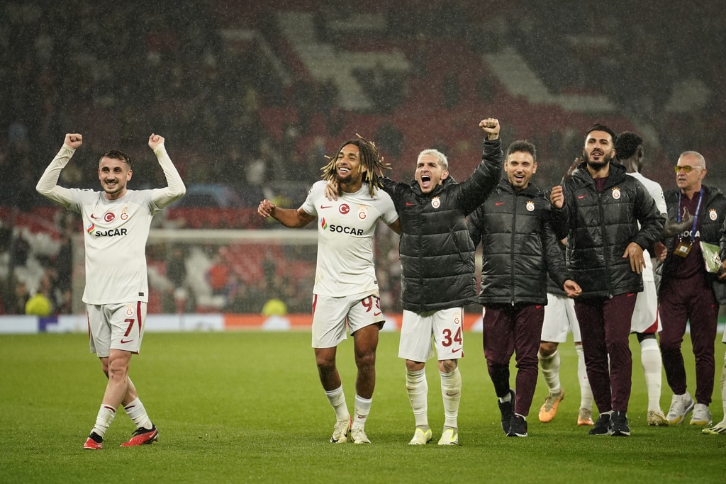 Galatasaray’s players celebrate after winning the Champions League group A soccer match between Manchester United and Galatasaray at the Old Trafford stadium in Manchester, England, Tuesday, Oct. 3, 2023. Galatasaray won 3-2. (AP Photo/Dave Thompson)