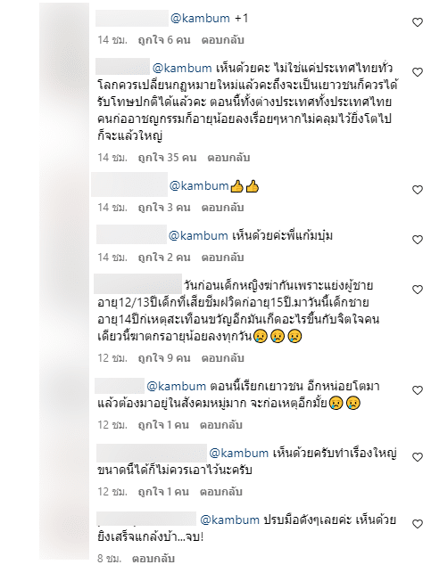 จากนั้นผู้ใช้งานโซเชียลก็ได้เข้ามาตอบกลับในเชิงเห็นด้วย โดยบอกว่า “เห็นด้วยค่ะ ไม่ใช่แค่ประเทศไทย ทั่วโลกควรเปลี่ยนกฎหมายใหม่แล้วค่ะ ถึงจะเป็นเยาวชนก็ควรได้รับโทษปกติได้แล้วค่ะ ตอนนี้ทั้งต่างประเทศ ทั้งประเทศไทย คนก่ออาชญกรรมก็อายุน้อยลงเรื่อย ๆ หากไม่คลุมไว้ยิ่งโตไปก็จะแล้วใหญ่”