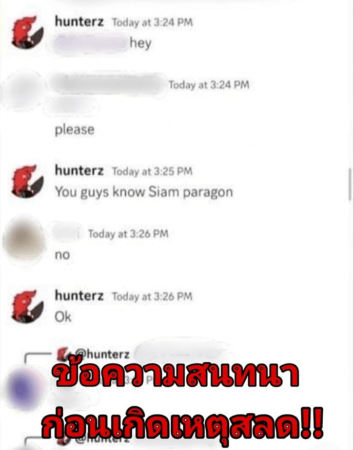 โดยทางเพจดาวแปดแฉกระบุว่า “นี้คือข้อมูลการสนทนาของผู้ก่อเหตุใช้ปืนยิงในห้างสยามพารากอน โดยผู้ก่อเหตุใช้นามแฝงว่า “hunterz” ทักหาเพื่อนสมาชิกในกลุ่ม โดยสอบถามว่า “You guys know Siam paragon” (พวกนายรู้จักสยามพารากอนไหม?) เมื่อช่วงเวลา 15.25 น. และเพื่อนบางคนตอบกลับว่าไม่รู้จัก ก่อนที่จะเกิดเหตุสลดทำให้มีผู้เสียชีวิต และบาดเจ็บ ชุดสืบสวนเร่งตรวจสอบข้อเท็จจริงในข้อความสนทนาที่ปรากฏ”