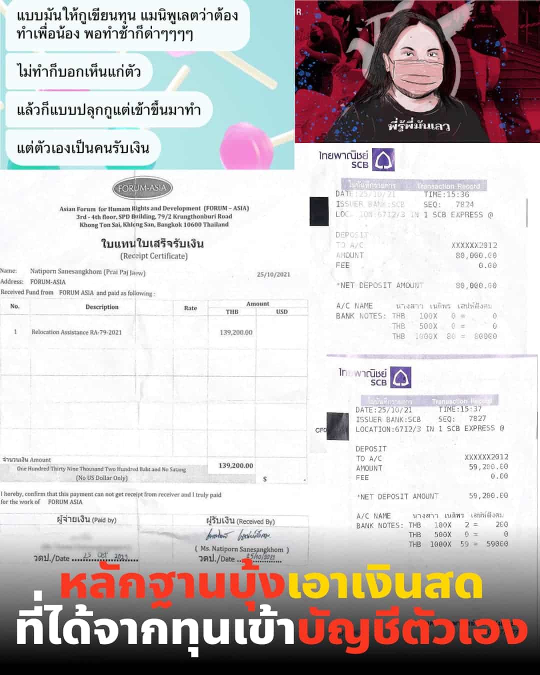 เพจ CSI LA ได้โพสต์ข้อความและภาพ เคลมว่าเป็นหลักฐาน บุ้ง ทะลุวัง นำเงินที่รับเงินจากทุนช่วยเหลือนักกิจกรรมเข้าบัญชีตัวเอง