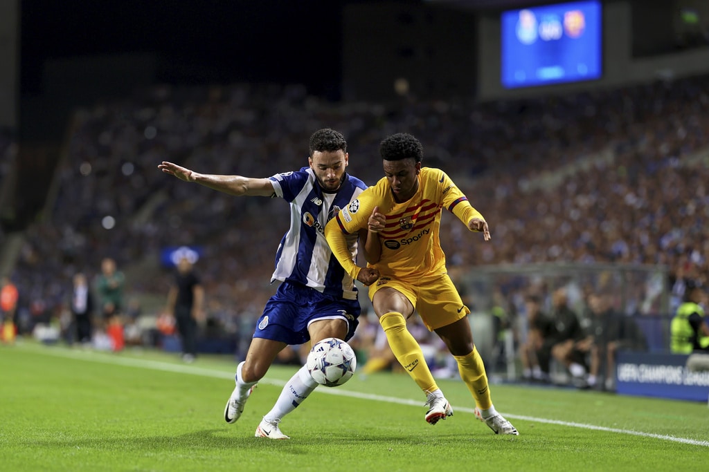 Porto’s Joao Mario vies for the ball with Barcelona’s Alejandro Balde, right, during a Champions League group H soccer match between FC Porto and Barcelona at the Dragao stadium in Porto, Portugal, Wednesday, Oct. 4, 2023. (AP Photo/Luis Vieira)