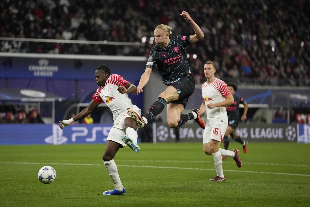 Manchester City’s Erling Haaland makes an attempt to score during the Champions League group G soccer match between RB Leipzig and Manchester City in Leipzig, Germany, Wednesday, Oct. 4, 2023. (AP Photo/Matthias Schrader)