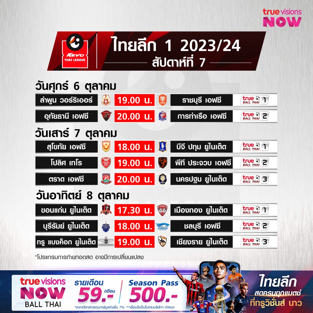 ตารางแข่งขัน รีโว่ 2023/24 ไทยลีก โปรแกรมฟุตบอลไทยลีก สัปดาห์ที่ 7 ทุกคู่ถ่ายทอดสดทาง AIS Play และ True Ball Thai