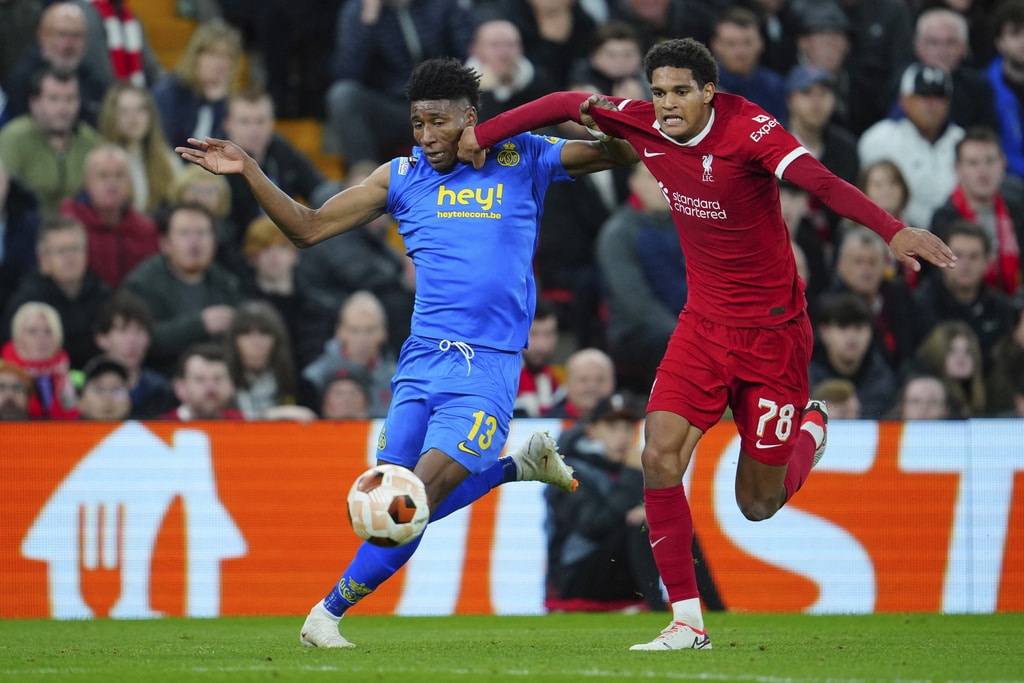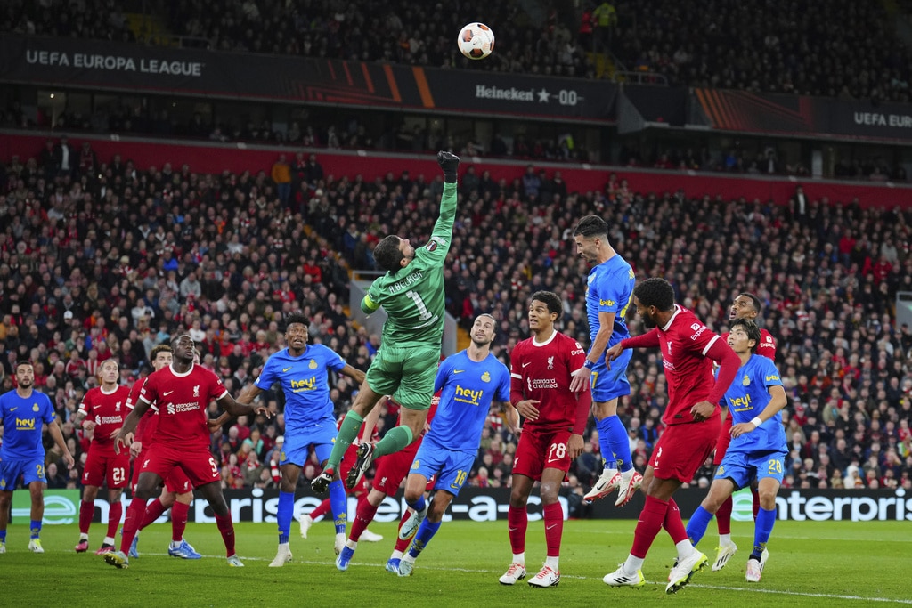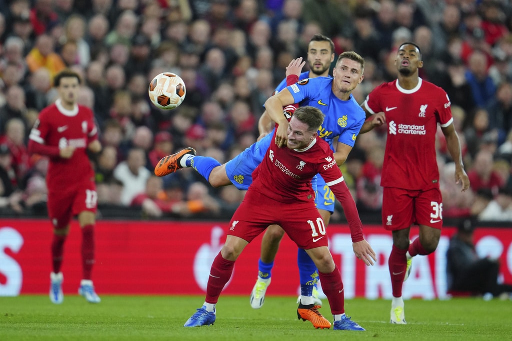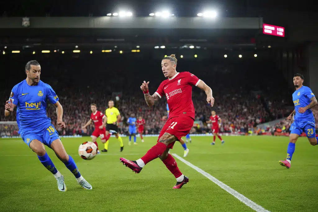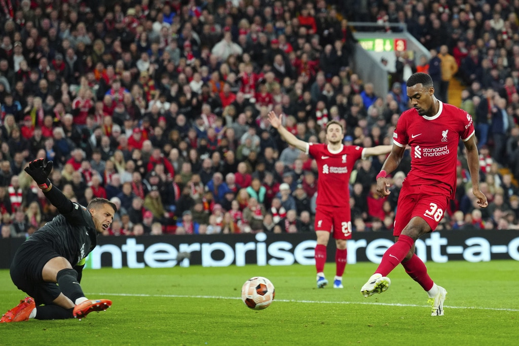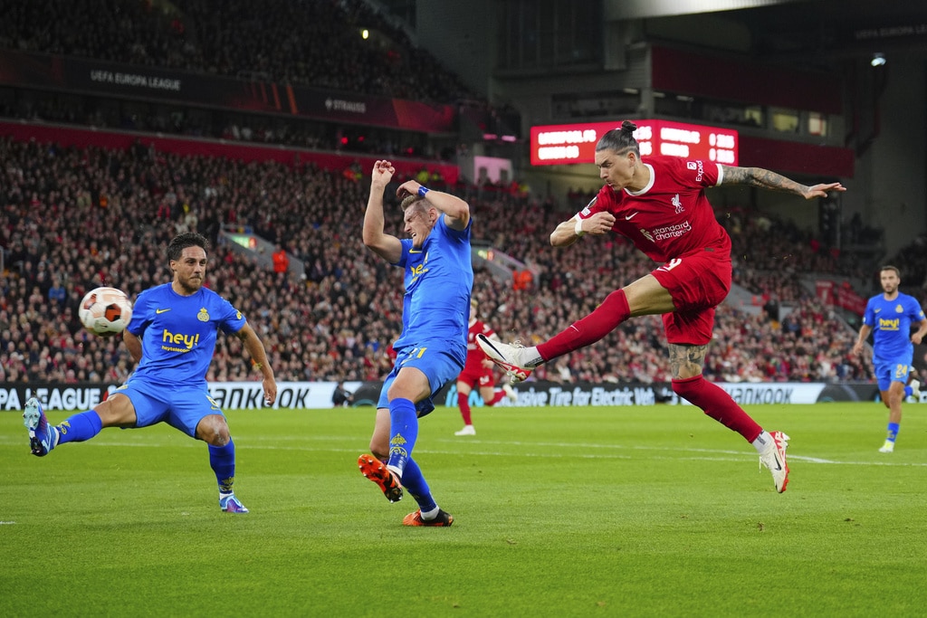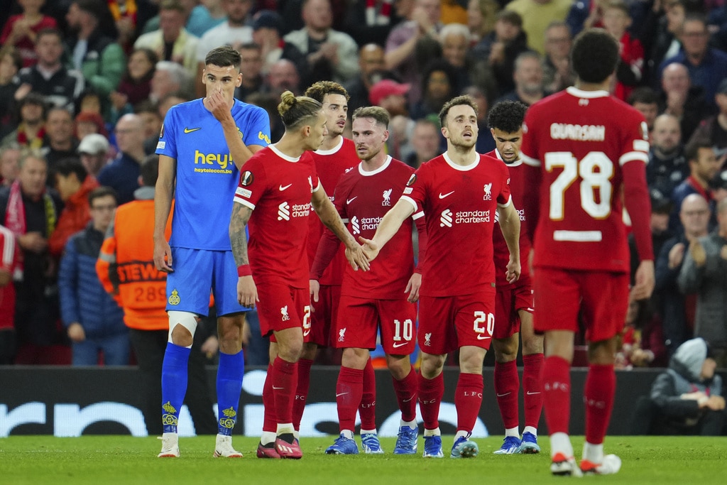 Liverpool’s Darwin Núñez (9) shoots wide as Union Saint-Gilloise’s Alessio Castro-Montes (21) defends during a Europa League Group E soccer match between Liverpool and Union Saint-Gilloise, Thursday, Oct. 5, 2023, at Anfield in Liverpool, England. (AP Photo/Jon Super)Union Saint-Gilloise’s Kevin Mac Allister, right, and Liverpool’s Diogo Jota (20) battle for the ball during a Europa League Group E soccer match between Liverpool and Union Saint-Gilloise, Thursday, Oct. 5, 2023, at Anfield in Liverpool, England. (AP Photo/Jon Super)Liverpool’s Trent Alexander-Arnold (66) plays the ball during a Europa League Group E soccer match between Liverpool and Union Saint-Gilloise, Thursday, Oct. 5, 2023, at Anfield in Liverpool, England. (AP Photo/Jon Super)Liverpool’s Wataru Endo (3) makes a pass as Union Saint-Gilloise’s Charles Vanhoutte (24) defends during a Europa League Group E soccer match between Liverpool and Union Saint-Gilloise, Thursday, Oct. 5, 2023, at Anfield in Liverpool, England. (AP Photo/Jon Super)Union Saint-Gilloise’s Kevin Mac Allister, right, and Liverpool’s Diogo Jota (20) battle for the ball during a Europa League Group E soccer match between Liverpool and Union Saint-Gilloise, Thursday, Oct. 5, 2023, at Anfield in Liverpool, England. (AP Photo/Jon Super)Liverpool’s Darwin Núñez (9) shoots at goal as Union Saint-Gilloise’s Alessio Castro-Montes (21) and Kevin Mac Allister (5) defend during a Europa League Group E soccer match between Liverpool and Union Saint-Gilloise, Thursday, Oct. 5, 2023, at Anfield in Liverpool, England. (AP Photo/Jon Super)Liverpool’s Ryan Gravenberch (38) scores a goal past Union Saint-Gilloise goalkeeper Anthony Moris (49) during a Europa League Group E soccer match between Liverpool and Union Saint-Gilloise, Thursday, Oct. 5, 2023, at Anfield in Liverpool, England. (AP Photo/Jon Super)Liverpool’s Ryan Gravenberch (38) celebrates after scoring a goal during a Europa League Group E soccer match between Liverpool and Union Saint-Gilloise, Thursday, Oct. 5, 2023, at Anfield in Liverpool, England. (AP Photo/Jon Super)Liverpool’s Alexis Mac Allister (10) shields the ball from Union Saint-Gilloise’s Alessio Castro-Montes (21) during a Europa League Group E soccer match between Liverpool and Union Saint-Gilloise, Thursday, Oct. 5, 2023, at Anfield in Liverpool, England. (AP Photo/Jon Super)Union Saint-Gilloise’s Alessio Castro-Montes (21) top battles for the ball with Liverpool’s Alexis Mac Allister (10) during a Europa League Group E soccer match between Liverpool and Union Saint-Gilloise, Thursday, Oct. 5, 2023, at Anfield in Liverpool, England. (AP Photo/Jon Super)Liverpool’s Jarell Quansah (78) and Union Saint-Gilloise’s Kevin Rodríguez (13) battle for the ball during a Europa League Group E soccer match between Liverpool and Union Saint-Gilloise, Thursday, Oct. 5, 2023, at Anfield in Liverpool, England. (AP Photo/Jon Super)Liverpool’s Jarell Quansah (78) and Union Saint-Gilloise’s Kevin Rodríguez (13) battle for the ball during a Europa League Group E soccer match between Liverpool and Union Saint-Gilloise, Thursday, Oct. 5, 2023, at Anfield in Liverpool, England. (AP Photo/Jon Super)Liverpool goalkeeper Alisson Becker (1) reaches high to punch the ball away during a Europa League Group E soccer match between Liverpool and Union Saint-Gilloise, Thursday, Oct. 5, 2023, at Anfield in Liverpool, England. (AP Photo/Jon Super)Liverpool’s Diogo Jota (20) is congratulated by teammates after scoring a goal during a Europa League Group E soccer match between Liverpool and Union Saint-Gilloise, Thursday, Oct. 5, 2023, at Anfield in Liverpool, England. (AP Photo/Jon Super)Liverpool manager Jurgen Klopp, second from right, embraces Darwin Núñez, right, after a Europa League Group E soccer match between Liverpool and Union Saint-Gilloise, Thursday, Oct. 5, 2023, at Anfield in Liverpool, England. (AP Photo/Jon Super)