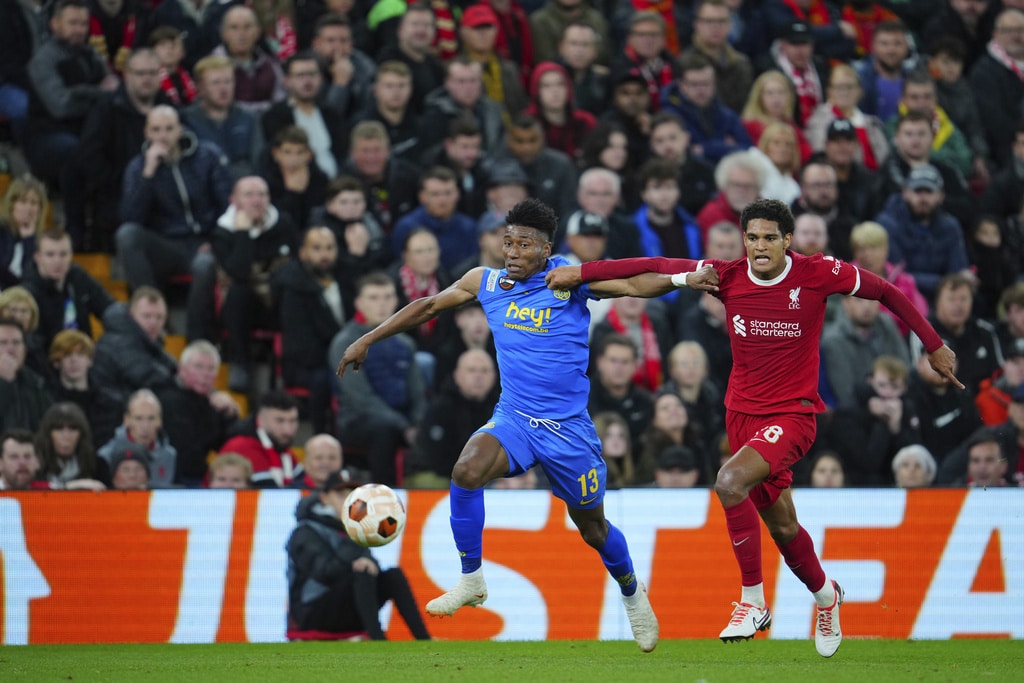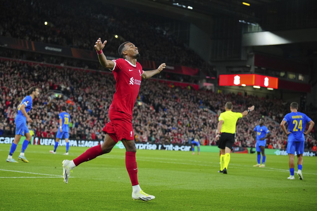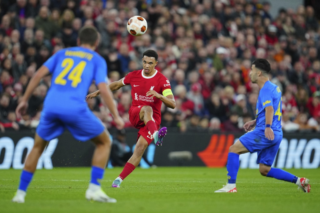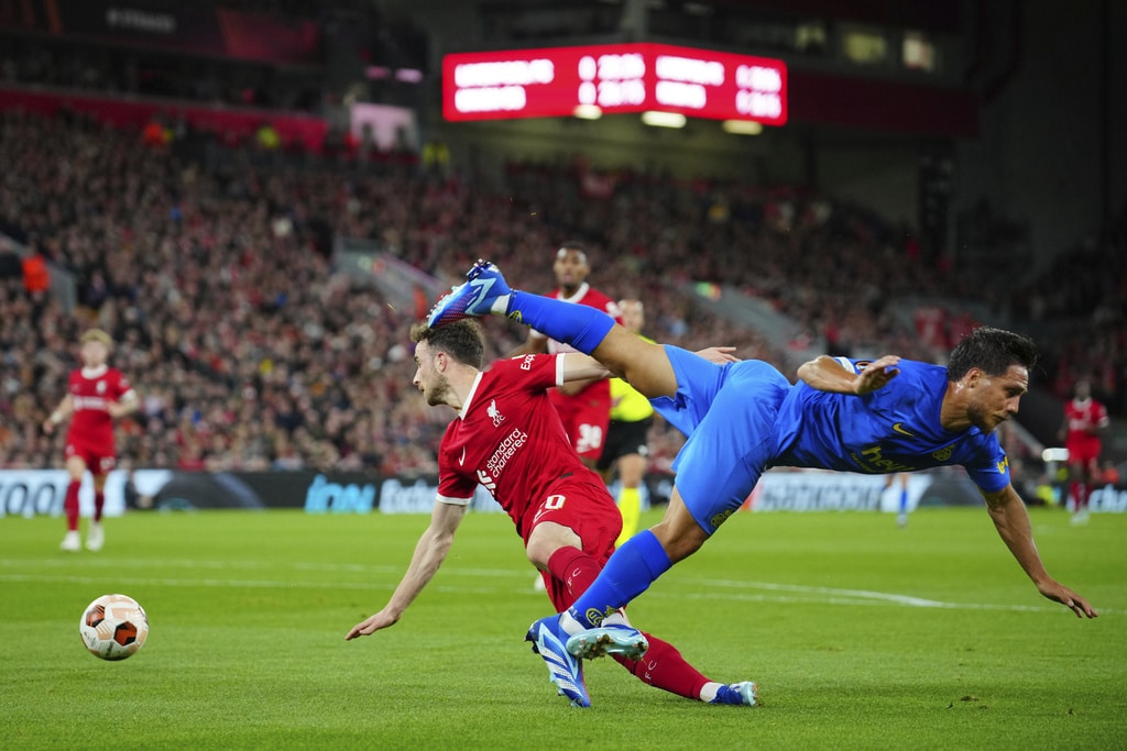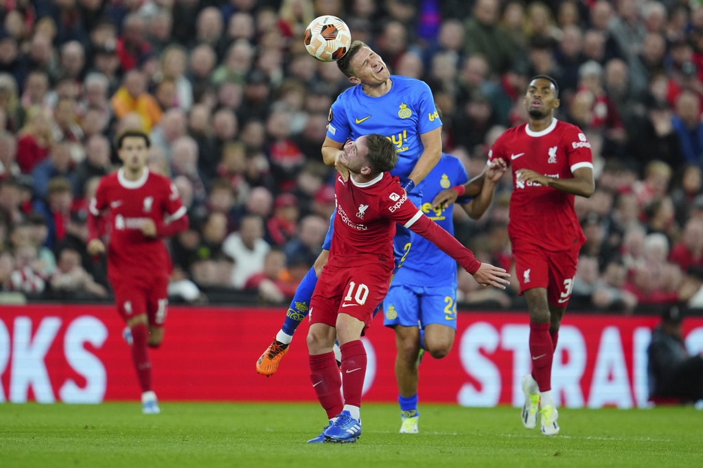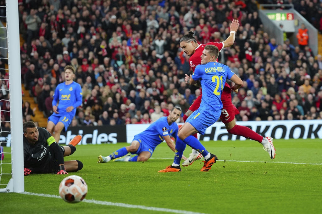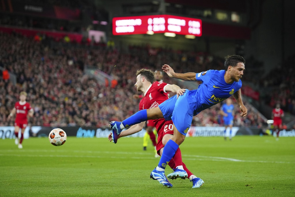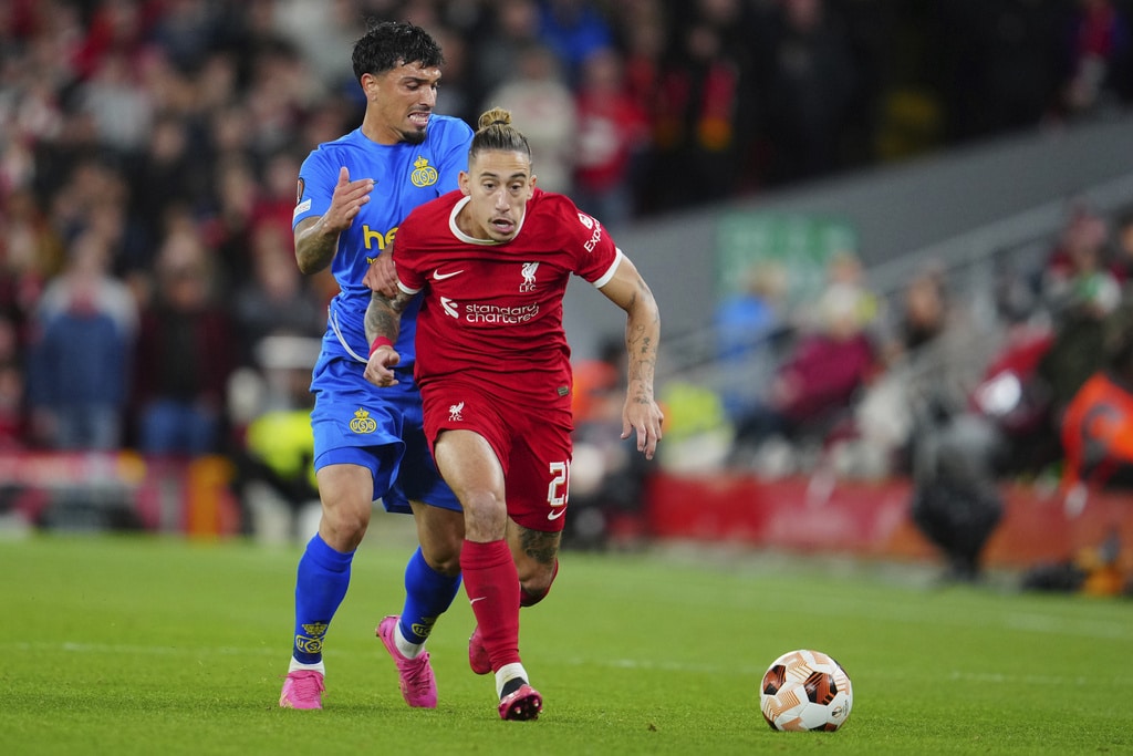 Liverpool’s Darwin Núñez (9) shoots wide as Union Saint-Gilloise’s Alessio Castro-Montes (21) defends during a Europa League Group E soccer match between Liverpool and Union Saint-Gilloise, Thursday, Oct. 5, 2023, at Anfield in Liverpool, England. (AP Photo/Jon Super)Union Saint-Gilloise’s Kevin Mac Allister, right, and Liverpool’s Diogo Jota (20) battle for the ball during a Europa League Group E soccer match between Liverpool and Union Saint-Gilloise, Thursday, Oct. 5, 2023, at Anfield in Liverpool, England. (AP Photo/Jon Super)Liverpool’s Trent Alexander-Arnold (66) plays the ball during a Europa League Group E soccer match between Liverpool and Union Saint-Gilloise, Thursday, Oct. 5, 2023, at Anfield in Liverpool, England. (AP Photo/Jon Super)Liverpool’s Wataru Endo (3) makes a pass as Union Saint-Gilloise’s Charles Vanhoutte (24) defends during a Europa League Group E soccer match between Liverpool and Union Saint-Gilloise, Thursday, Oct. 5, 2023, at Anfield in Liverpool, England. (AP Photo/Jon Super)Union Saint-Gilloise’s Kevin Mac Allister, right, and Liverpool’s Diogo Jota (20) battle for the ball during a Europa League Group E soccer match between Liverpool and Union Saint-Gilloise, Thursday, Oct. 5, 2023, at Anfield in Liverpool, England. (AP Photo/Jon Super)Liverpool’s Darwin Núñez (9) shoots at goal as Union Saint-Gilloise’s Alessio Castro-Montes (21) and Kevin Mac Allister (5) defend during a Europa League Group E soccer match between Liverpool and Union Saint-Gilloise, Thursday, Oct. 5, 2023, at Anfield in Liverpool, England. (AP Photo/Jon Super)Liverpool’s Ryan Gravenberch (38) scores a goal past Union Saint-Gilloise goalkeeper Anthony Moris (49) during a Europa League Group E soccer match between Liverpool and Union Saint-Gilloise, Thursday, Oct. 5, 2023, at Anfield in Liverpool, England. (AP Photo/Jon Super)Liverpool’s Ryan Gravenberch (38) celebrates after scoring a goal during a Europa League Group E soccer match between Liverpool and Union Saint-Gilloise, Thursday, Oct. 5, 2023, at Anfield in Liverpool, England. (AP Photo/Jon Super)Liverpool’s Alexis Mac Allister (10) shields the ball from Union Saint-Gilloise’s Alessio Castro-Montes (21) during a Europa League Group E soccer match between Liverpool and Union Saint-Gilloise, Thursday, Oct. 5, 2023, at Anfield in Liverpool, England. (AP Photo/Jon Super)Union Saint-Gilloise’s Alessio Castro-Montes (21) top battles for the ball with Liverpool’s Alexis Mac Allister (10) during a Europa League Group E soccer match between Liverpool and Union Saint-Gilloise, Thursday, Oct. 5, 2023, at Anfield in Liverpool, England. (AP Photo/Jon Super)Liverpool’s Jarell Quansah (78) and Union Saint-Gilloise’s Kevin Rodríguez (13) battle for the ball during a Europa League Group E soccer match between Liverpool and Union Saint-Gilloise, Thursday, Oct. 5, 2023, at Anfield in Liverpool, England. (AP Photo/Jon Super)Liverpool’s Jarell Quansah (78) and Union Saint-Gilloise’s Kevin Rodríguez (13) battle for the ball during a Europa League Group E soccer match between Liverpool and Union Saint-Gilloise, Thursday, Oct. 5, 2023, at Anfield in Liverpool, England. (AP Photo/Jon Super)Liverpool goalkeeper Alisson Becker (1) reaches high to punch the ball away during a Europa League Group E soccer match between Liverpool and Union Saint-Gilloise, Thursday, Oct. 5, 2023, at Anfield in Liverpool, England. (AP Photo/Jon Super)Liverpool’s Diogo Jota (20) is congratulated by teammates after scoring a goal during a Europa League Group E soccer match between Liverpool and Union Saint-Gilloise, Thursday, Oct. 5, 2023, at Anfield in Liverpool, England. (AP Photo/Jon Super)Liverpool manager Jurgen Klopp, second from right, embraces Darwin Núñez, right, after a Europa League Group E soccer match between Liverpool and Union Saint-Gilloise, Thursday, Oct. 5, 2023, at Anfield in Liverpool, England. (AP Photo/Jon Super)