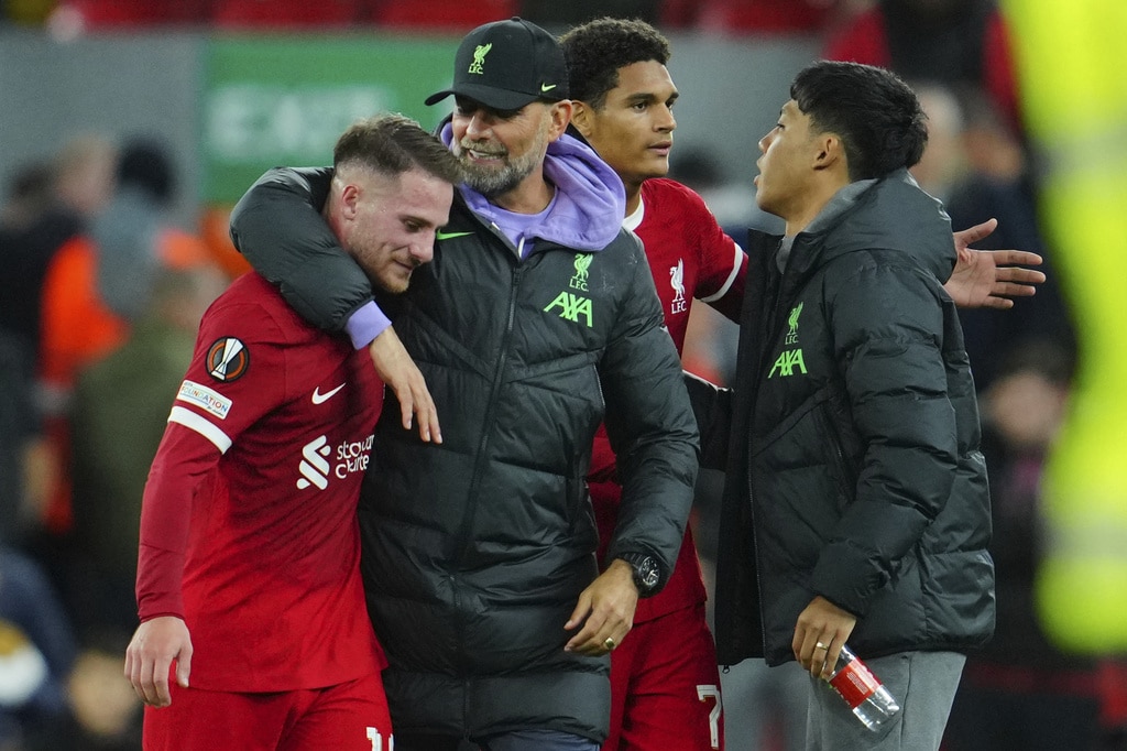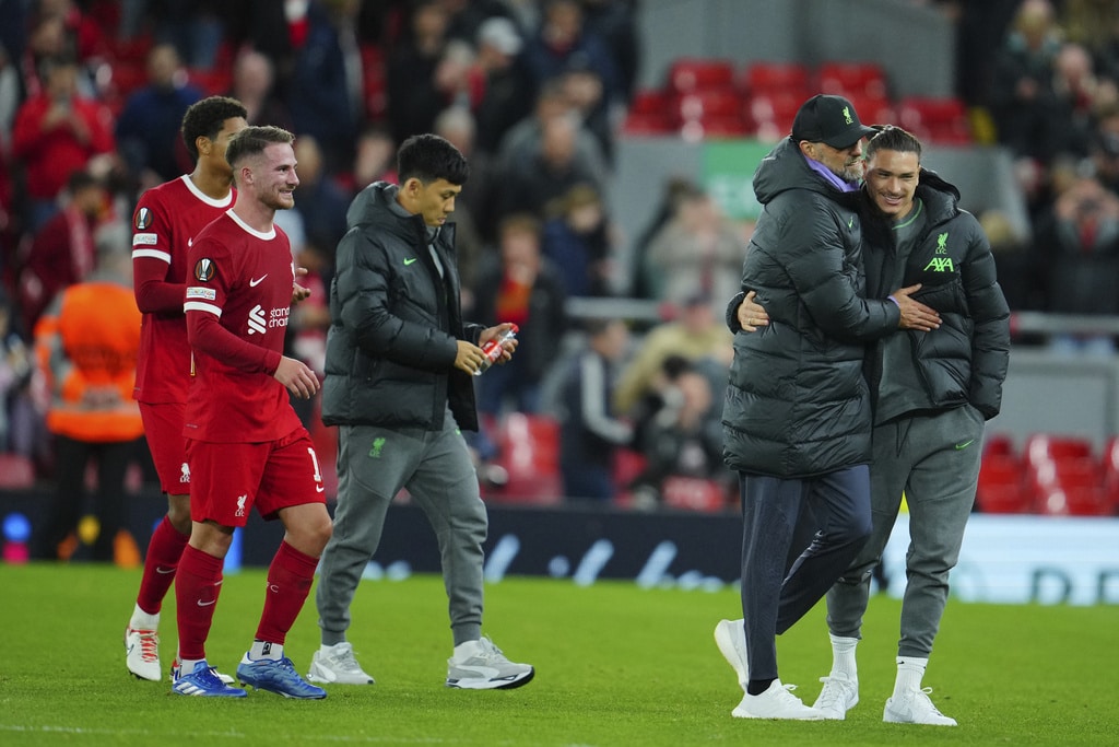 Liverpool manager Jurgen Klopp, second from left, embraces Alexis Mac Allister, left, after a Europa League Group E soccer match between Liverpool and Union Saint-Gilloise, Thursday, Oct. 5, 2023, at Anfield in Liverpool, England. (AP Photo/Jon Super)