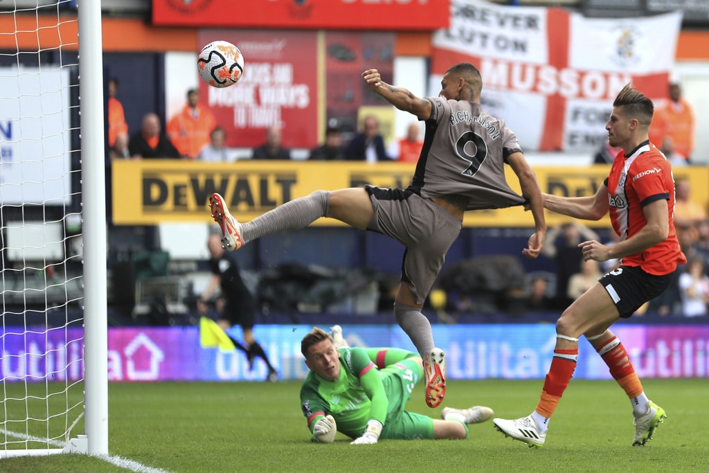 Tottenham Hotspur’s Richarlison, centre, heads wide of the goal, during the English Premier League soccer match between Luton Town and Tottenham Hotspur, at Kenilworth Road, in Luton, England, Saturday, Oct. 7, 2023. (Bradley Collyer/PA via AP)