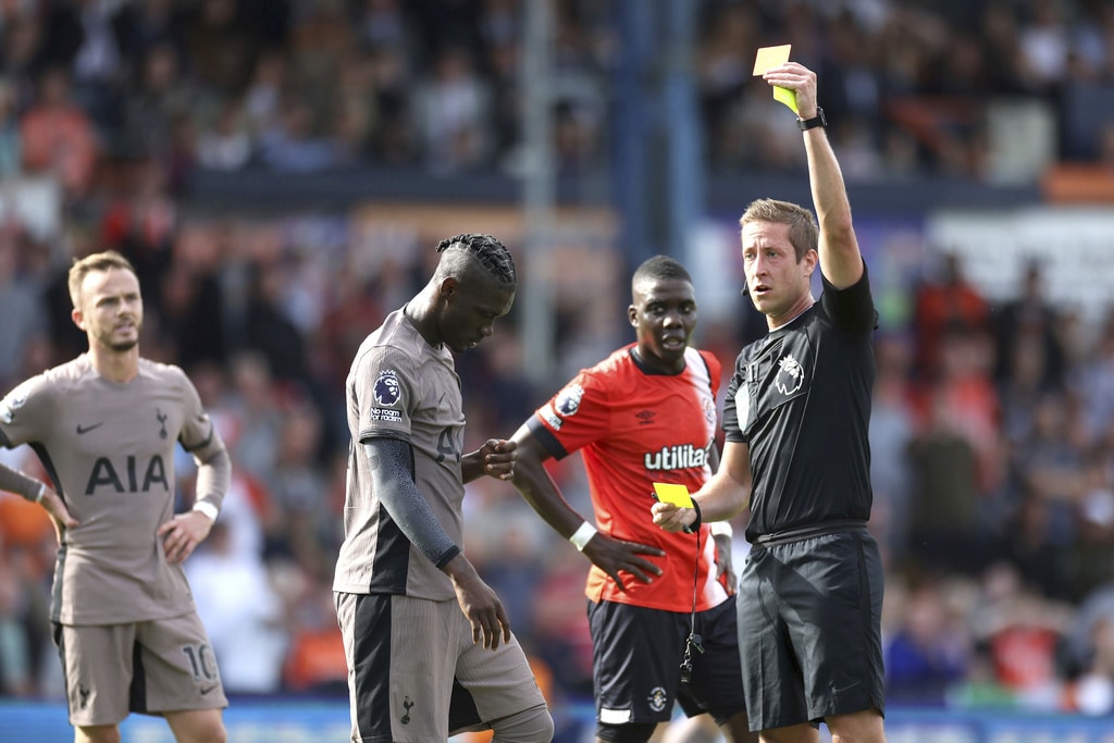 Tottenham Hotspur’s Yves Bissouma is shown a red card by referee John Brooks after picking up a second yellow card, during the English Premier League soccer match between Luton Town and Tottenham Hotspur, at Kenilworth Road, in Luton, England, Saturday, Oct. 7, 2023. (Bradley Collyer/PA via AP)