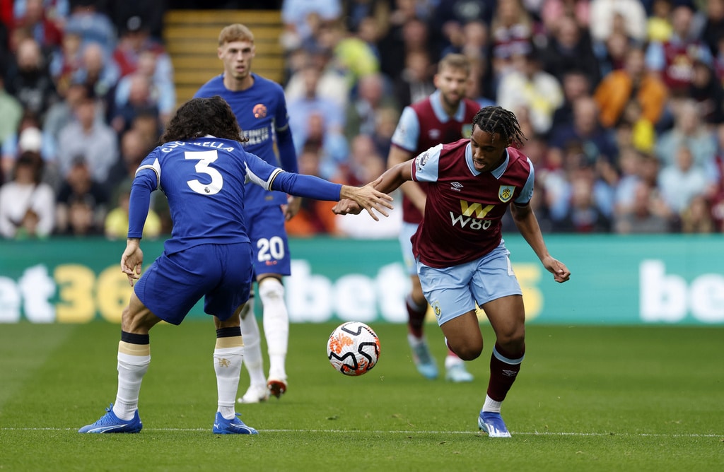 Burnley’s Wilson Odobert, right and Chelsea’s Marc Cucurella vie for the ball, during the English Premier League soccer match between Burnley and Chelsea, at Turf Moor, in Burnley, England, Saturday, Oct. 7, 2023. (Richard Sellers/PA via AP)