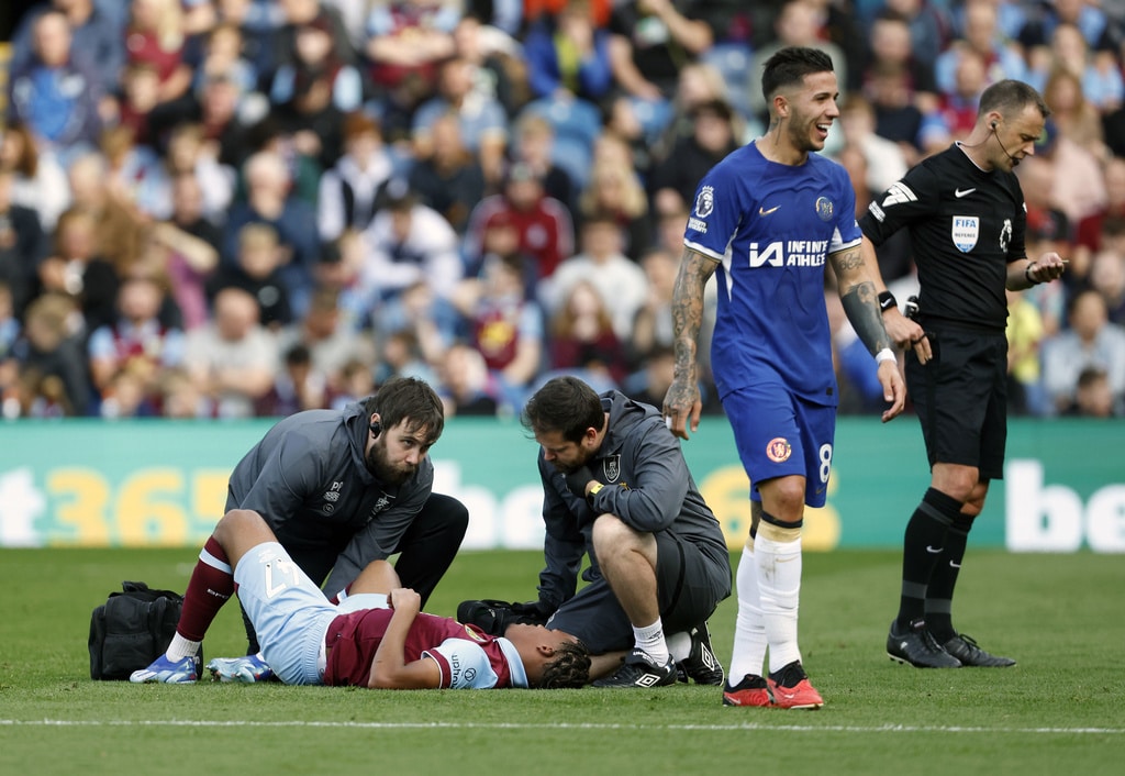 Burnley’s Wilson Odobert receives treatment for an injury, during the English Premier League soccer match between Burnley and Chelsea, at Turf Moor, in Burnley, England, Saturday, Oct. 7, 2023. (Richard Sellers/PA via AP)