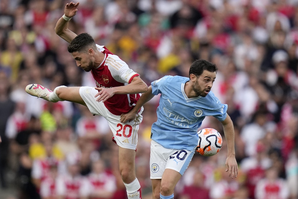 Arsenal’s Jorginho, left, and Manchester City’s Bernardo Silva challenge for the ball during the English Premier League soccer match between Arsenal and Manchester City at the Emirates Stadium in London, Sunday, Oct. 8, 2023.(AP Photo/Kirsty Wigglesworth)