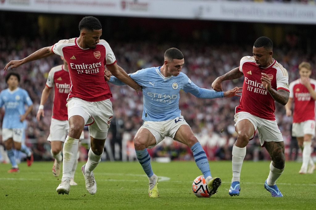 Arsenal’s Gabriel Jesus, left, and Manchester City’s Phil Foden challenge for the ball during the English Premier League soccer match between Arsenal and Manchester City at the Emirates Stadium in London, Sunday, Oct. 8, 2023.(AP Photo/Kirsty Wigglesworth)