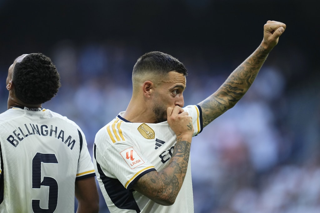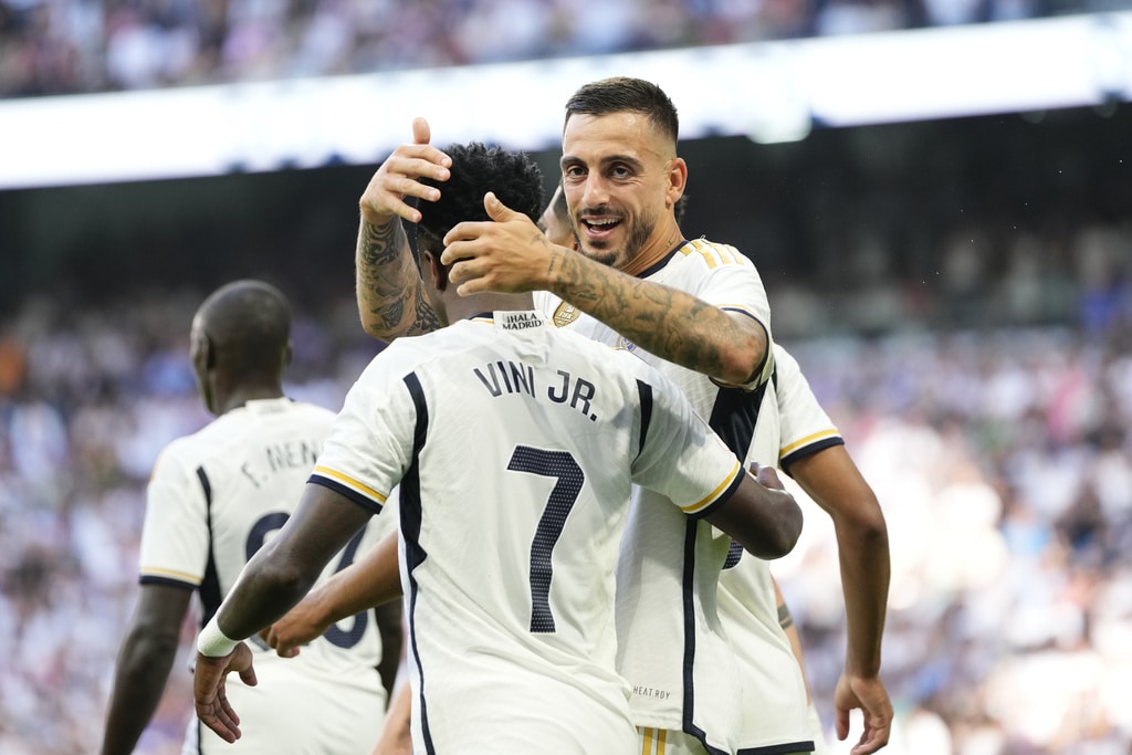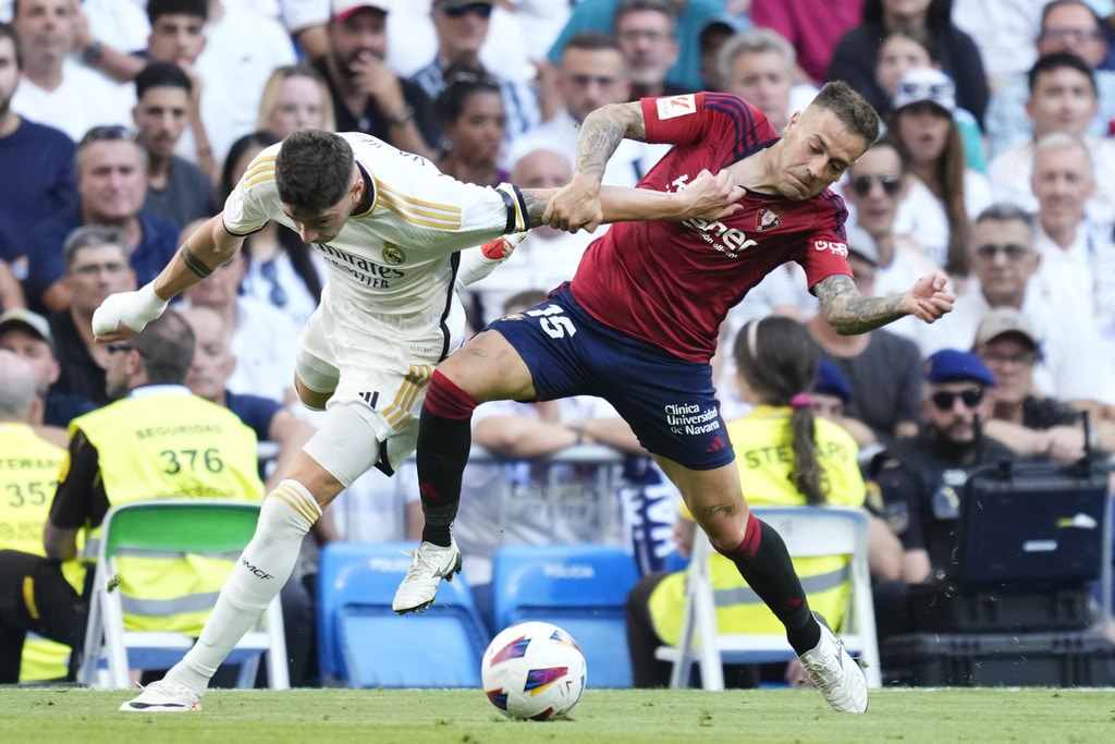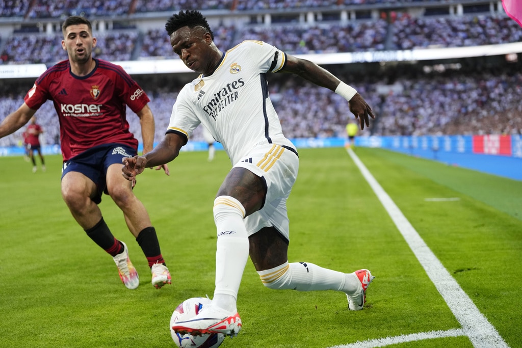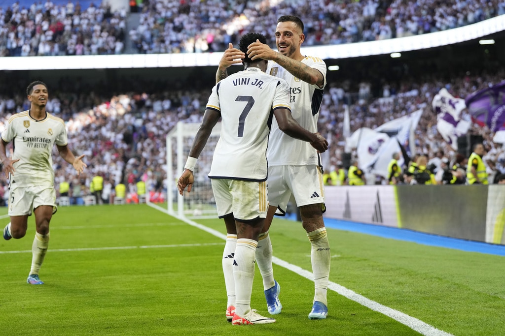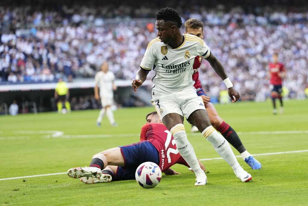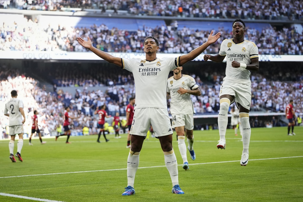 Real Madrid’s Vinicius Junior reacts during the Spanish La Liga soccer match between Real Madrid and Osasuna at the Santiago Bernabéu stadium in Madrid, Spain, Saturday, Oct. 7, 2023. (AP Photo/Jose Breton)Real Madrid’s Joselu, centre, in action during the Spanish La Liga soccer match between Real Madrid and Osasuna at the Santiago Bernabéu stadium in Madrid, Spain, Saturday, Oct. 7, 2023. (AP Photo/Jose Breton)Real Madrid’s Vinicius Junior in action during Spanish La Liga soccer match between Real Madrid and Osasuna at the Santiago Bernabéu stadium in Madrid, Spain, Saturday, Oct. 7, 2023. (AP Photo/Jose Breton)Real Madrid’s Vinicius Junior in action during Spanish La Liga soccer match between Real Madrid and Osasuna at the Santiago Bernabéu stadium in Madrid, Spain, Saturday, Oct. 7, 2023. (AP Photo/Jose Breton)Real Madrid’s Federico Valverde, left, challenges for the ball with Osasuna’s Ruben Pena during the Spanish La Liga soccer match between Real Madrid and Osasuna at the Santiago Bernabéu stadium in Madrid, Spain, Saturday, Oct. 7, 2023. (AP Photo/Jose Breton)Real Madrid’s Vinicius Junior, left, challenges for the ball with Osasuna’s David Garcia during the Spanish La Liga soccer match between Real Madrid and Osasuna at the Santiago Bernabéu stadium in Madrid, Spain, Saturday, Oct. 7, 2023. (AP Photo/Jose Breton)Real Madrid’s Luka Modric challenges for the ball with Osasuna’s Lucas Torro during the Spanish La Liga soccer match between Real Madrid and Osasuna at the Santiago Bernabéu stadium in Madrid, Spain, Saturday, Oct. 7, 2023. (AP Photo/Jose Breton)Real Madrid’s Luka Modric challenges for the ball with Osasuna’s Lucas Torro during the Spanish La Liga soccer match between Real Madrid and Osasuna at the Santiago Bernabéu stadium in Madrid, Spain, Saturday, Oct. 7, 2023. (AP Photo/Jose Breton)Real Madrid’s Luka Modric reacts during the Spanish La Liga soccer match between Real Madrid and Osasuna at the Santiago Bernabéu stadium in Madrid, Spain, Saturday, Oct. 7, 2023. (AP Photo/Jose Breton)Real Madrid’s Jude Bellingham, right, in action against Osasuna’s David Garcia, left, and Osasuna’s Jesus Areso during the Spanish La Liga soccer match between Real Madrid and Osasuna at the Santiago Bernabéu stadium in Madrid, Spain, Saturday, Oct. 7, 2023. (AP Photo/Jose Breton)Real Madrid’s Joselu celebrates with Real Madrid’s Vinicius Junior after scoring his side’s fourth goal during the Spanish La Liga soccer match between Real Madrid and Osasuna at the Santiago Bernabéu stadium in Madrid, Spain, Saturday, Oct. 7, 2023. (AP Photo/Jose Breton)Real Madrid’s Vinicius Junior, left, challenges for the ball with Osasuna’s David Garcia during the Spanish La Liga soccer match between Real Madrid and Osasuna at the Santiago Bernabéu stadium in Madrid, Spain, Saturday, Oct. 7, 2023. (AP Photo/Jose Breton)Real Madrid’s Joselu reacts during the Spanish La Liga soccer match between Real Madrid and Osasuna at the Santiago Bernabéu stadium in Madrid, Spain, Saturday, Oct. 7, 2023. (AP Photo/Jose Breton)Real Madrid’s Brahim Diaz, left, challenges for the ball with Osasuna’s Lucas Torro during the Spanish La Liga soccer match between Real Madrid and Osasuna at the Santiago Bernabéu stadium in Madrid, Spain, Saturday, Oct. 7, 2023. (AP Photo/Jose Breton)Real Madrid’s Joselu, right, celebrates with Real Madrid’s Vinicius Junior after scoring his side’s fourth goal during the Spanish La Liga soccer match between Real Madrid and Osasuna at the Santiago Bernabéu stadium in Madrid, Spain, Saturday, Oct. 7, 2023. (AP Photo/Jose Breton)Real Madrid’s Jude Bellingham celebrates after scoring his side’s opening goal during Spanish La Liga soccer match between Real Madrid and Osasuna at the Santiago Bernabéu stadium in Madrid, Spain, Saturday, Oct. 7, 2023. (AP Photo/Jose Breton)Real Madrid’s Jude Bellingham celebrates with teammates after scoring his side’s opening goal during Spanish La Liga soccer match between Real Madrid and Osasuna at the Santiago Bernabéu stadium in Madrid, Spain, Saturday, Oct. 7, 2023. (AP Photo/Jose Breton)