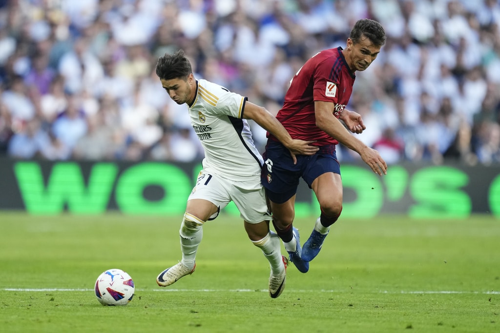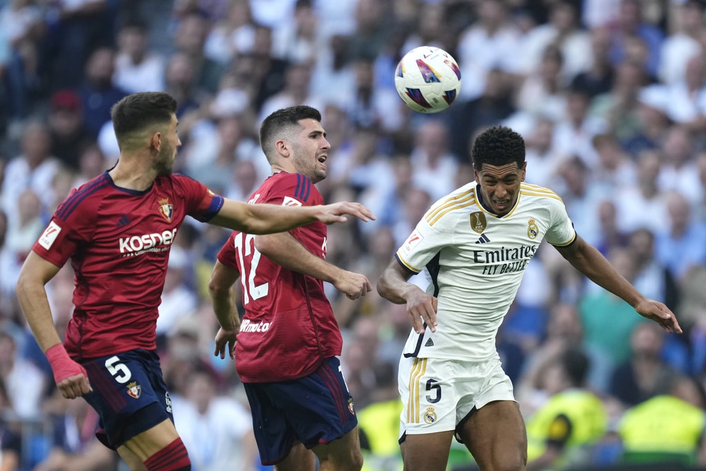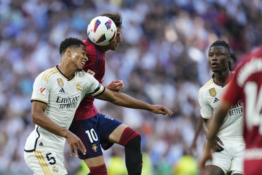 Real Madrid’s Jude Bellingham, left, challenges for the ball with Osasuna’s Aimar Oroz during the Spanish La Liga soccer match between Real Madrid and Osasuna at the Santiago Bernabéu stadium in Madrid, Spain, Saturday, Oct. 7, 2023. (AP Photo/Jose Breton)