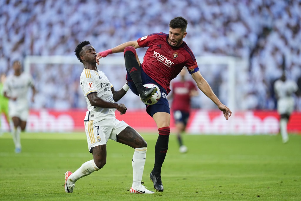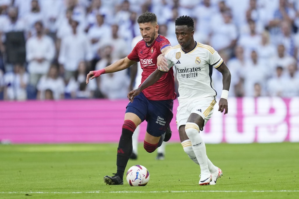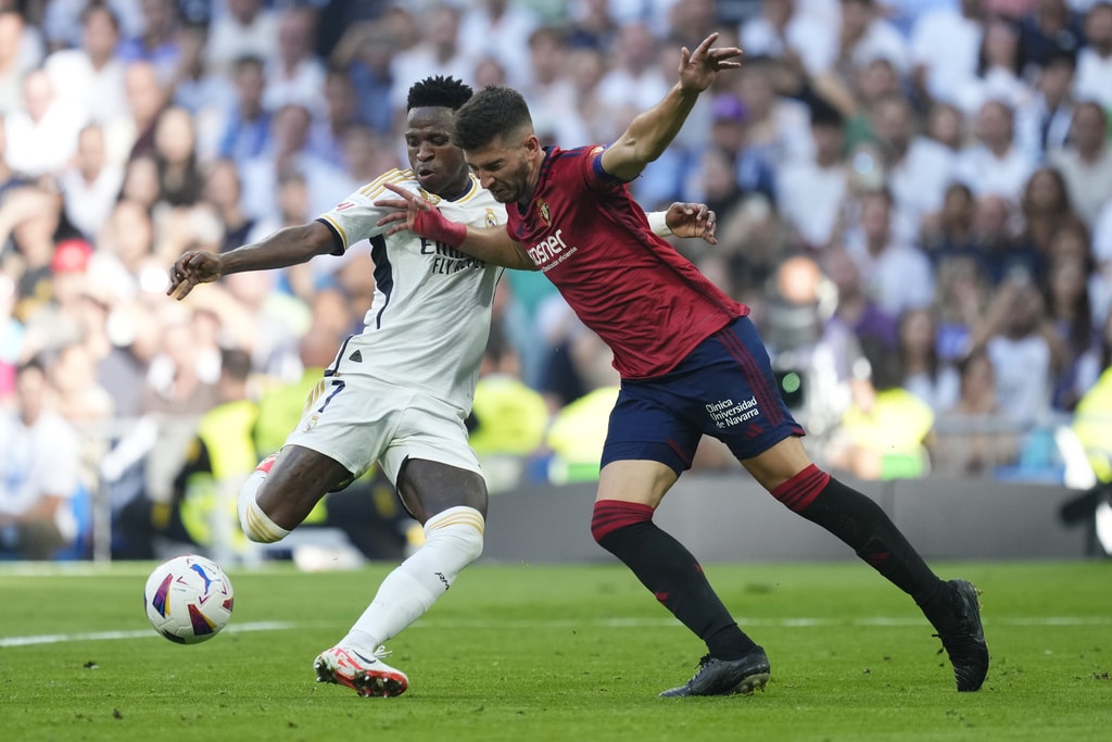 Osasuna’s David Garcia, left, challenges for the ball with Real Madrid’s Vinicius Junior during Spanish La Liga soccer match between Real Madrid and Osasuna at the Santiago Bernabéu stadium in Madrid, Spain, Saturday, Oct. 7, 2023. (AP Photo/Jose Breton)