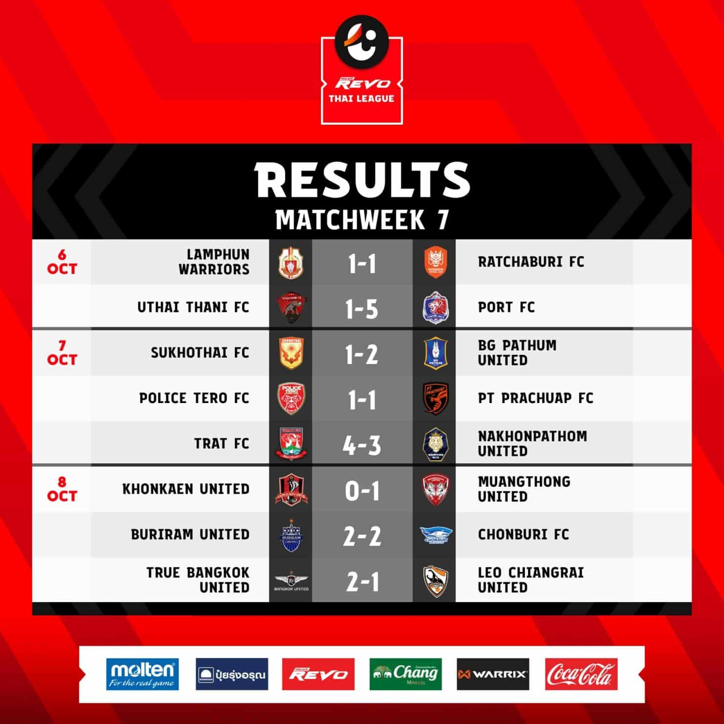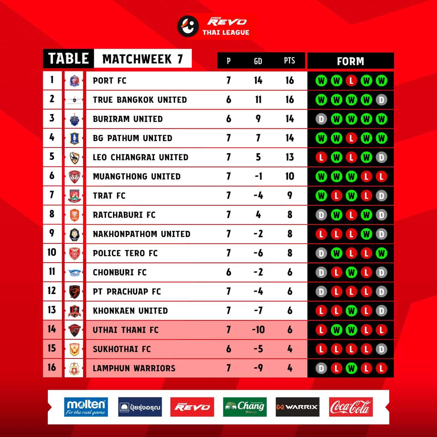 สรุปผลการแข่งขัน รีโว่ ไทยลีก 2023/24 หลังจบนัดที่ 7