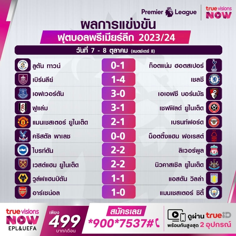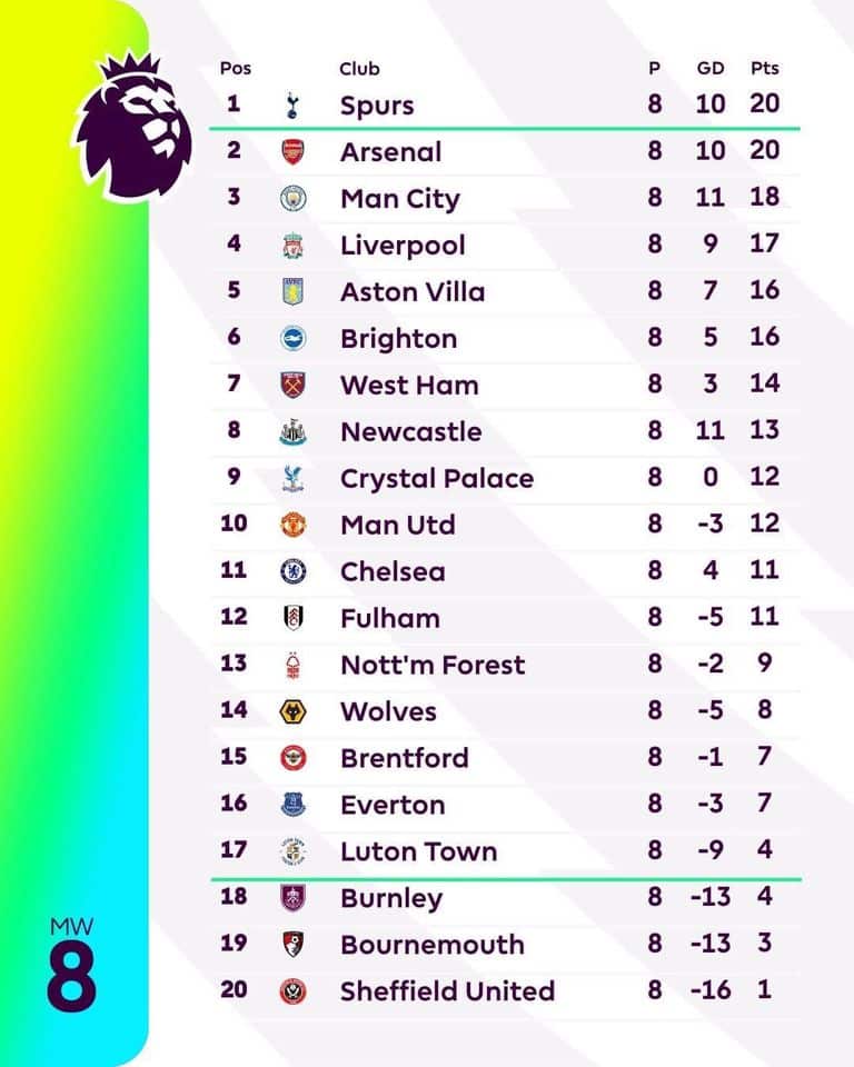 สรุปผลการแข่งขัน พรีเมียร์ลีก อังกฤษ 2023/24 หลังจบนัดที่ 8