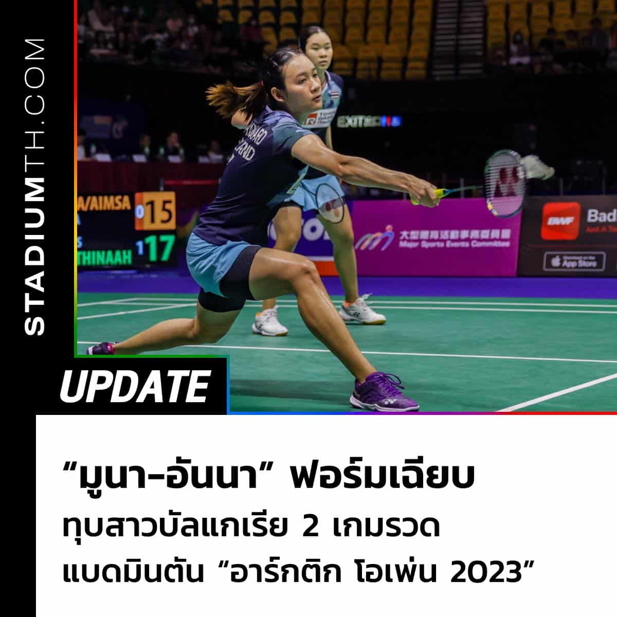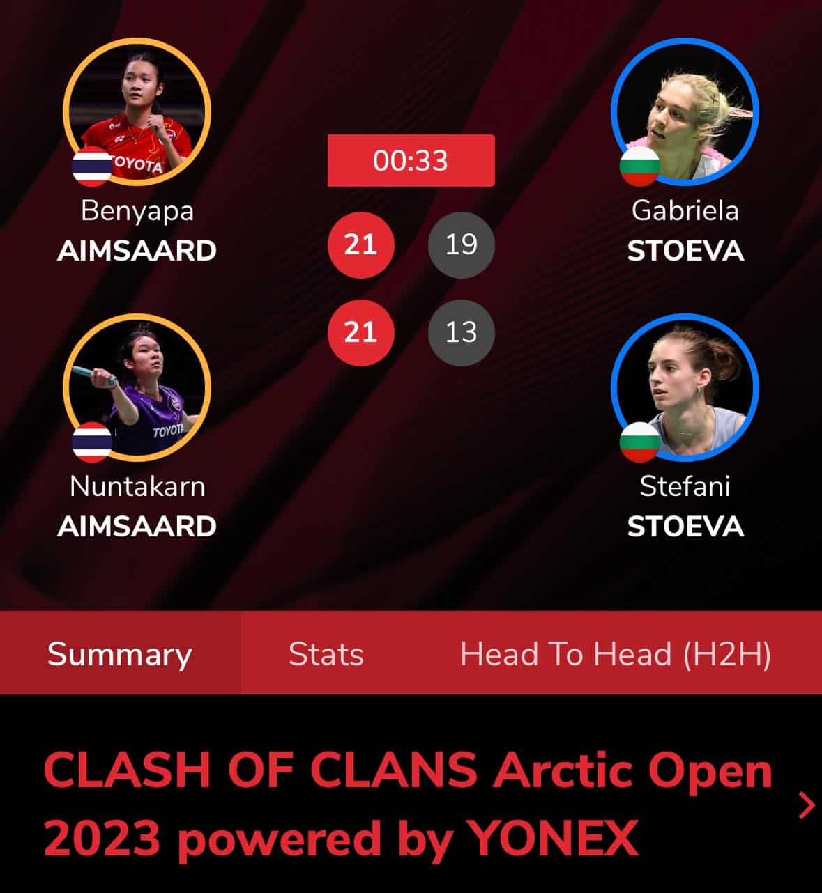 การแข่งขันแบดมินตันเวิลด์ทัวร์ซุปเปอร์ 500 รายการ “อาร์กติก โอเพ่น 2023” ที่ประเทศฟินแลนด์ รอบแรก เมื่อวันที่ 11 ตุลาคม “อันนา” นันทน์กาญจน์ เอี่ยมสอาด และ “มูนา” เบญญาภา เอี่ยมสอาด นักแบดสาวไทย พบกับ Gabriela, Stefani STOEVA จาก บัลแกเรีย