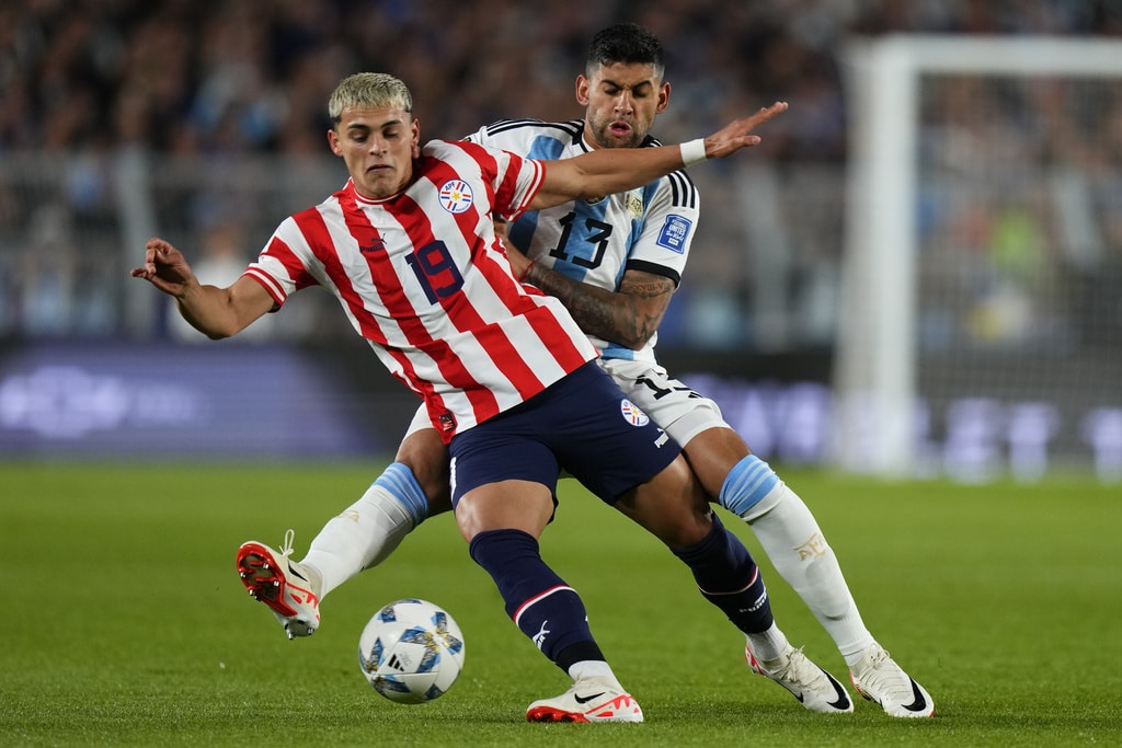 Argentina’s Cristian Romero, back, challenges Paraguay’s Ramon Sosa during a qualifying soccer match for the FIFA World Cup 2026 at the Monumental stadium in Buenos Aires, Argentina, Thursday, Oct. 12, 2023. (AP Photo/Natacha Pisarenko)