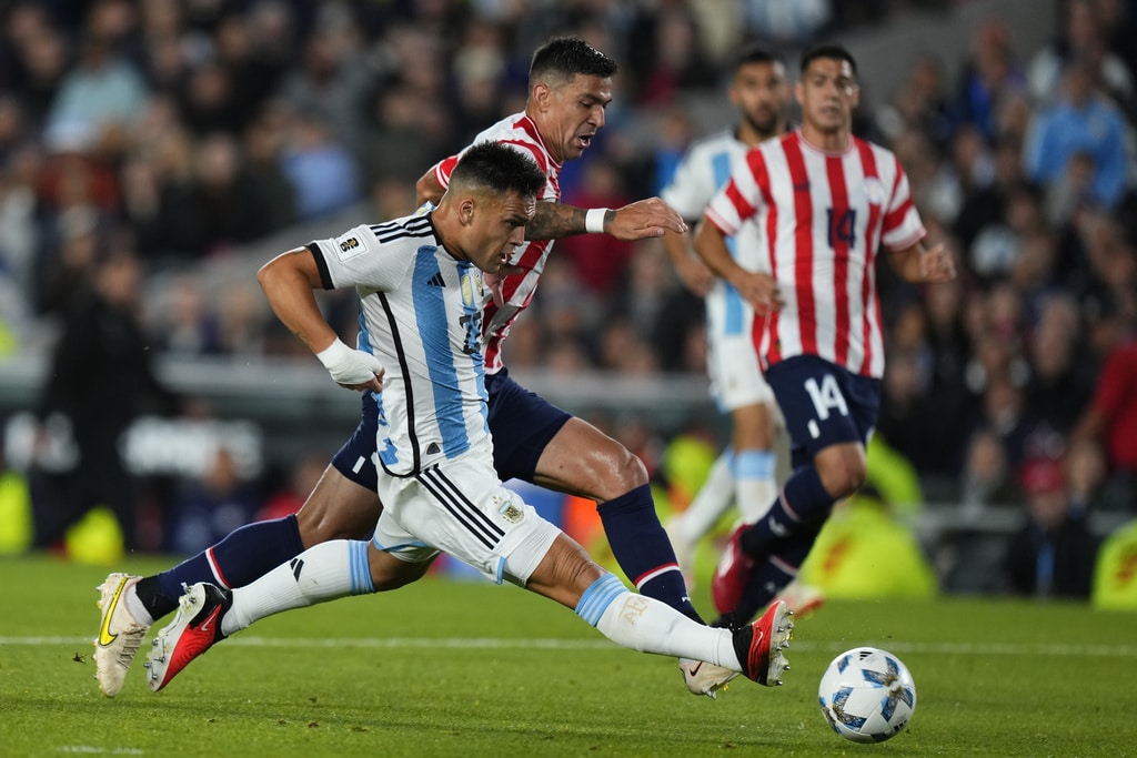 Argentina’s Lautaro Martinez dribbles past Paraguay’s Fabian Balbuena during a qualifying soccer match for the FIFA World Cup 2026 at the Monumental stadium in Buenos Aires, Argentina, Thursday, Oct. 12, 2023. (AP Photo/Natacha Pisarenko)