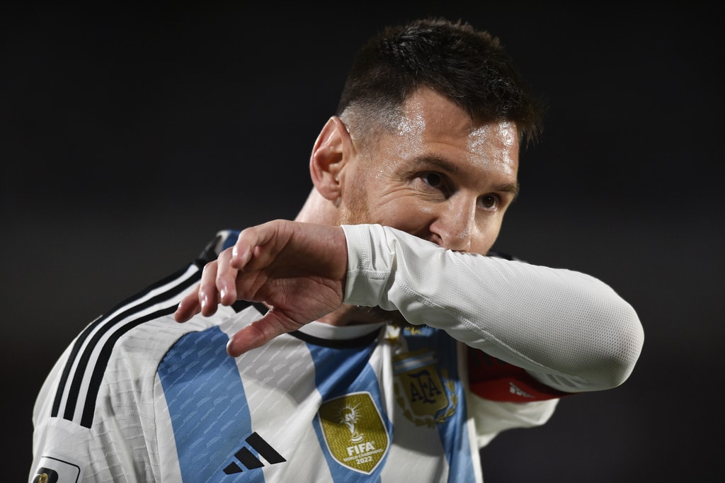 Argentina’s Lionel Messi gestures during a qualifying soccer match for the FIFA World Cup 2026 against Paraguay at the Monumental stadium in Buenos Aires, Argentina, Thursday, Oct. 12, 2023. (AP Photo/Gustavo Garello)