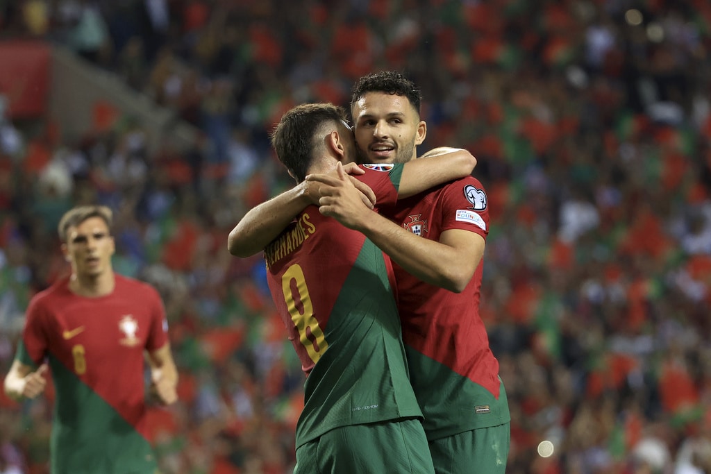 Portugal’s Goncalo Ramos, right, celebrates with Bruno Fernandes after scoring the opening goal during the Euro 2024 group J qualifying soccer match between Portugal and Slovakia at the Dragao stadium in Porto, Portugal, Friday, Oct. 13, 2023. (AP Photo/Luis Vieira)