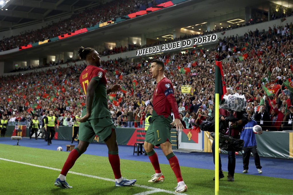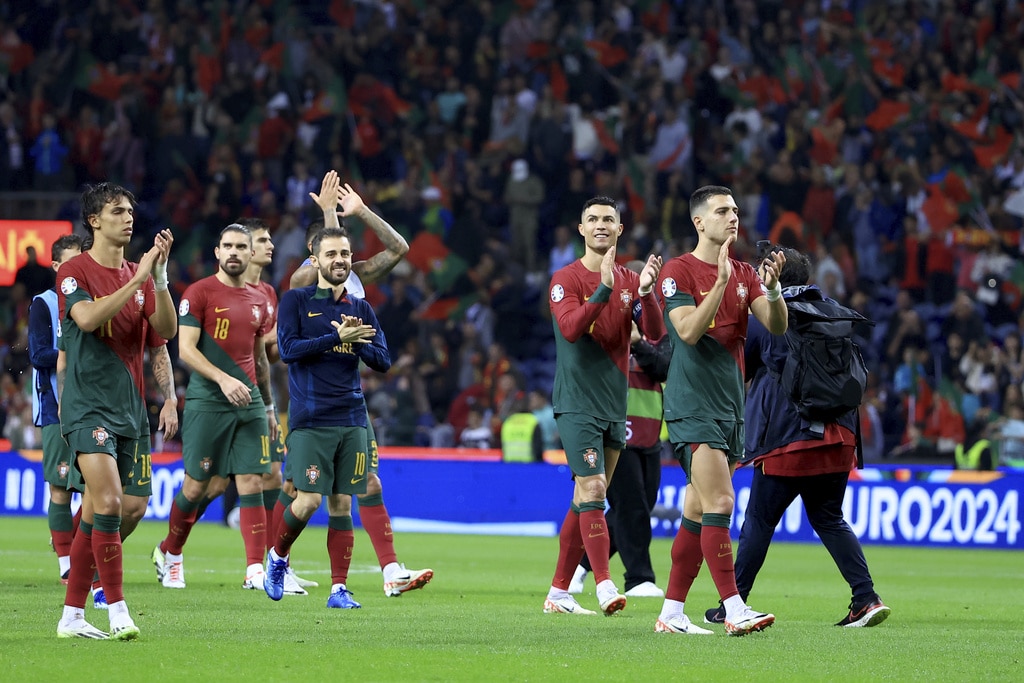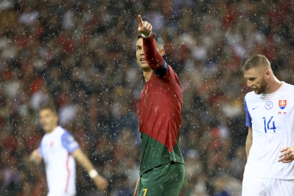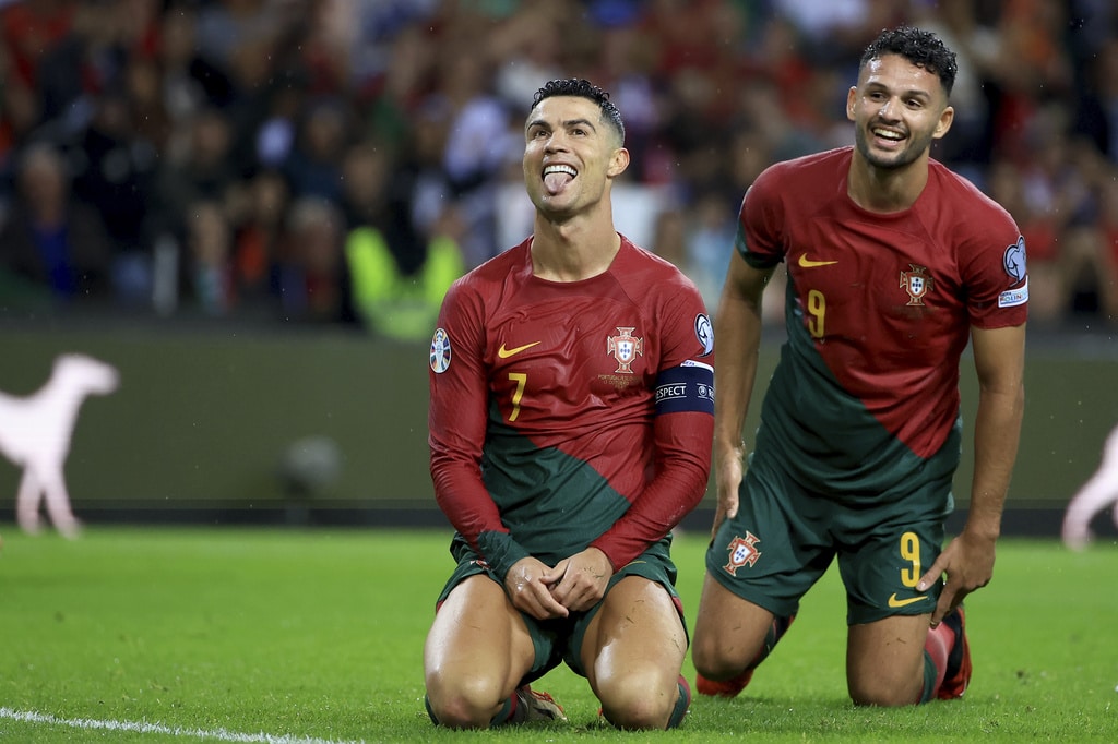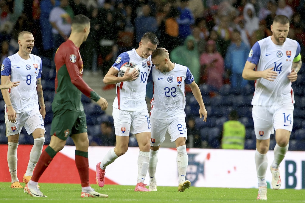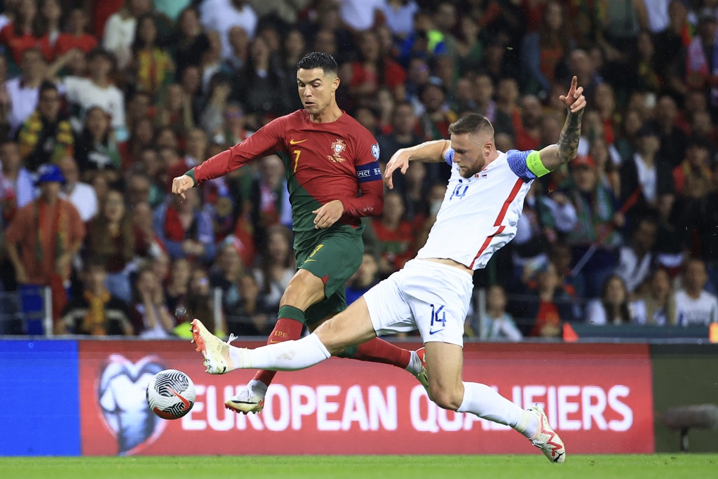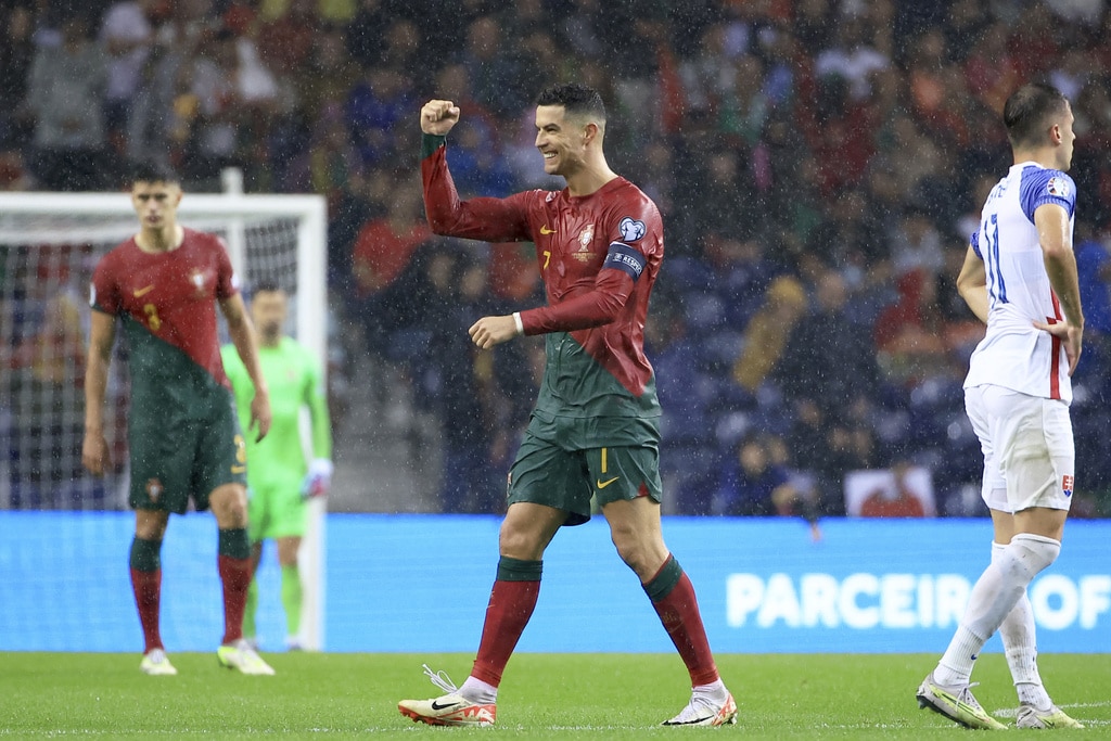 Portugal’s Cristiano Ronaldo vies for the ball with Slovakia’s Milan Skriniar, right, during the Euro 2024 group J qualifying soccer match between Portugal and Slovakia at the Dragao stadium in Porto, Portugal, Friday, Oct. 13, 2023. (AP Photo/Luis Vieira)Portugal’s Cristiano Ronaldo celebrates after scoring his side’s second goal from the penalty spot during the Euro 2024 group J qualifying soccer match between Portugal and Slovakia at the Dragao stadium in Porto, Portugal, Friday, Oct. 13, 2023. (AP Photo/Luis Vieira)Portugal’s Cristiano Ronaldo scores his side’s second goal from the penalty spot during the Euro 2024 group J qualifying soccer match between Portugal and Slovakia at the Dragao stadium in Porto, Portugal, Friday, Oct. 13, 2023. (AP Photo/Luis Vieira)Portugal’s Cristiano Ronaldo celebrates with Rafael Leao, left, after scoring his side’s second goal from the penalty spot during the Euro 2024 group J qualifying soccer match between Portugal and Slovakia at the Dragao stadium in Porto, Portugal, Friday, Oct. 13, 2023. (AP Photo/Luis Vieira)Portugal’s Cristiano Ronaldo and Goncalo Ramos, right, react after a missed chance to score during the Euro 2024 group J qualifying soccer match between Portugal and Slovakia at the Dragao stadium in Porto, Portugal, Friday, Oct. 13, 2023. (AP Photo/Luis Vieira)Portugal’s Bruno Fernandes, left, drives the ball past Slovakia’s Stanislav Lobotka during the Euro 2024 group J qualifying soccer match between Portugal and Slovakia at the Dragao stadium in Porto, Portugal, Friday, Oct. 13, 2023. (AP Photo/Luis Vieira)Portugal’s Goncalo Ramos celebrates after scoring the opening goal during the Euro 2024 group J qualifying soccer match between Portugal and Slovakia at the Dragao stadium in Porto, Portugal, Friday, Oct. 13, 2023. (AP Photo/Luis Vieira)Portugal coach Roberto Martinez stands by the touchline during the Euro 2024 group J qualifying soccer match between Portugal and Slovakia at the Dragao stadium in Porto, Portugal, Friday, Oct. 13, 2023. (AP Photo/Luis Vieira)Portugal’s Joao Cancelo vies for the ball with Slovakia’s Robert Bozenik, right, during the Euro 2024 group J qualifying soccer match between Portugal and Slovakia at the Dragao stadium in Porto, Portugal, Friday, Oct. 13, 2023. (AP Photo/Luis Vieira)Portugal’s Cristiano Ronaldo gestures during the Euro 2024 group J qualifying soccer match between Portugal and Slovakia at the Dragao stadium in Porto, Portugal, Friday, Oct. 13, 2023. (AP Photo/Luis Vieira)Portugal’s Rafael Leao, right, tries to drive the ball past Slovakia’s Stanislav Lobotka during the Euro 2024 group J qualifying soccer match between Portugal and Slovakia at the Dragao stadium in Porto, Portugal, Friday, Oct. 13, 2023. (AP Photo/Luis Vieira)Portugal’s Joao Palhinha vies for the ball with Slovakia’s Ondrej Duda, left, during the Euro 2024 group J qualifying soccer match between Portugal and Slovakia at the Dragao stadium in Porto, Portugal, Friday, Oct. 13, 2023. (AP Photo/Luis Vieira)Portugal’s Cristiano Ronaldo celebrates at the end of the Euro 2024 group J qualifying soccer match between Portugal and Slovakia at the Dragao stadium in Porto, Portugal, Friday, Oct. 13, 2023. Portugal won 3-2 to qualify for the Euro 2024 championship in Germany. (AP Photo/Luis Vieira)Portugal’s Cristiano Ronaldo celebrates after scoring his side’s third goal during the Euro 2024 group J qualifying soccer match between Portugal and Slovakia at the Dragao stadium in Porto, Portugal, Friday, Oct. 13, 2023. (AP Photo/Luis Vieira)Portugal’s Cristiano Ronaldo celebrates after scoring his side’s third goal during the Euro 2024 group J qualifying soccer match between Portugal and Slovakia at the Dragao stadium in Porto, Portugal, Friday, Oct. 13, 2023. (AP Photo/Luis Vieira)Slovakia’s Stanislav Lobotka, 2nd right, celebrates with Robert Polievka after scoring his side’s second goal during the Euro 2024 group J qualifying soccer match between Portugal and Slovakia at the Dragao stadium in Porto, Portugal, Friday, Oct. 13, 2023. (AP Photo/Luis Vieira)Portugal players celebrate at the end of the Euro 2024 group J qualifying soccer match between Portugal and Slovakia at the Dragao stadium in Porto, Portugal, Friday, Oct. 13, 2023. Portugal won 3-2 to qualify for the Euro 2024 championship in Germany. (AP Photo/Luis Vieira)Portugal coach Roberto Martinez speaks with Portugal’s Diogo Jota during the Euro 2024 group J qualifying soccer match between Portugal and Slovakia at the Dragao stadium in Porto, Portugal, Friday, Oct. 13, 2023. (AP Photo/Luis Vieira)