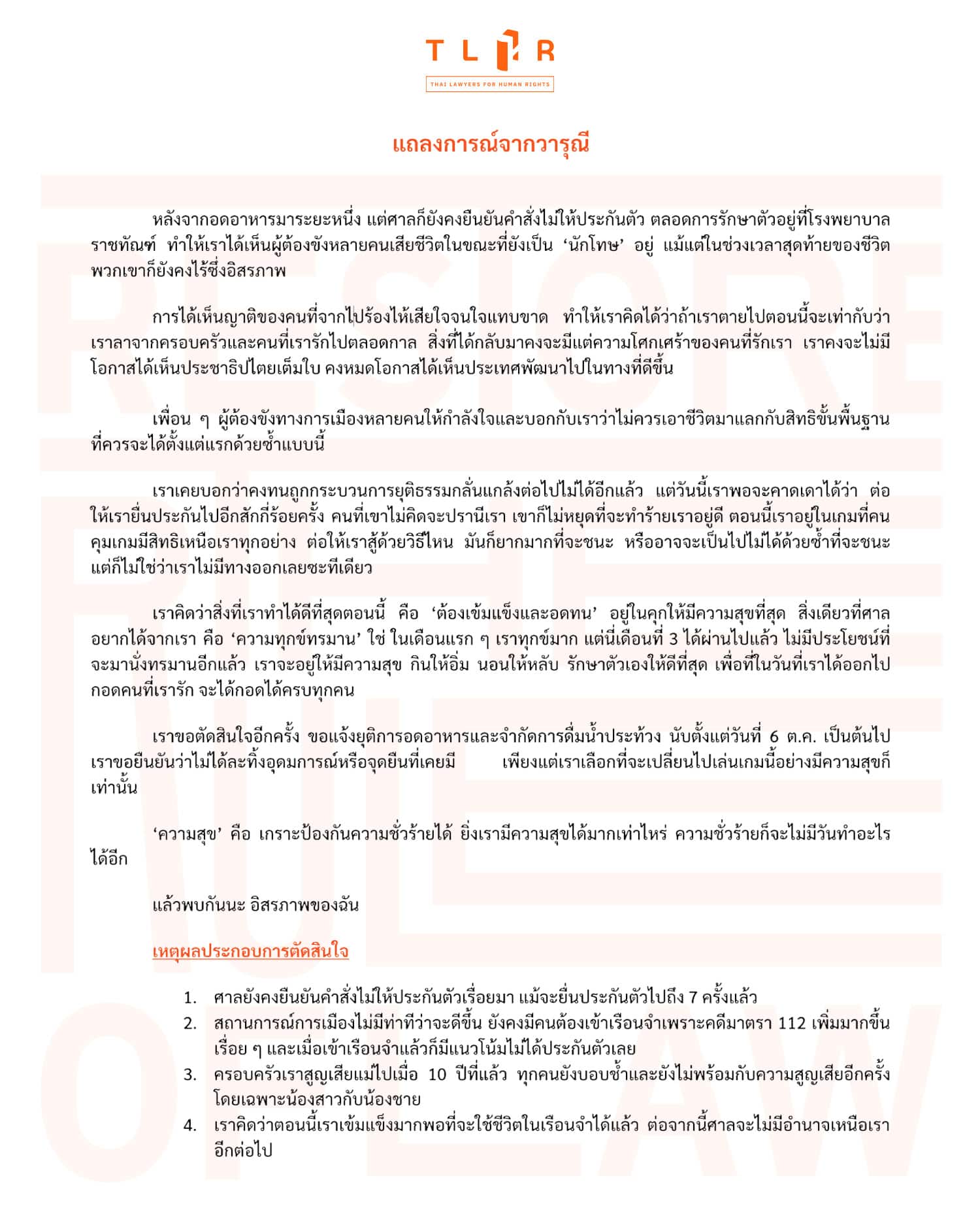 เราขอตัดสินใจอีกครั้ง ขอแจ้งยุติการอดอาหารและจำกัดการดื่มน้ำประท้วง นับตั้งแต่วันที่ 6 ต.ค. เป็นต้นไป เราขอยืนยันว่าไม่ได้ละทิ้งอุดมการณ์หรือจุดยืนที่เคยมี เพียงแต่เราเลือกที่จะเปลี่ยนไปเล่นเกมนี้อย่างมีความสุขก็เท่านั้น