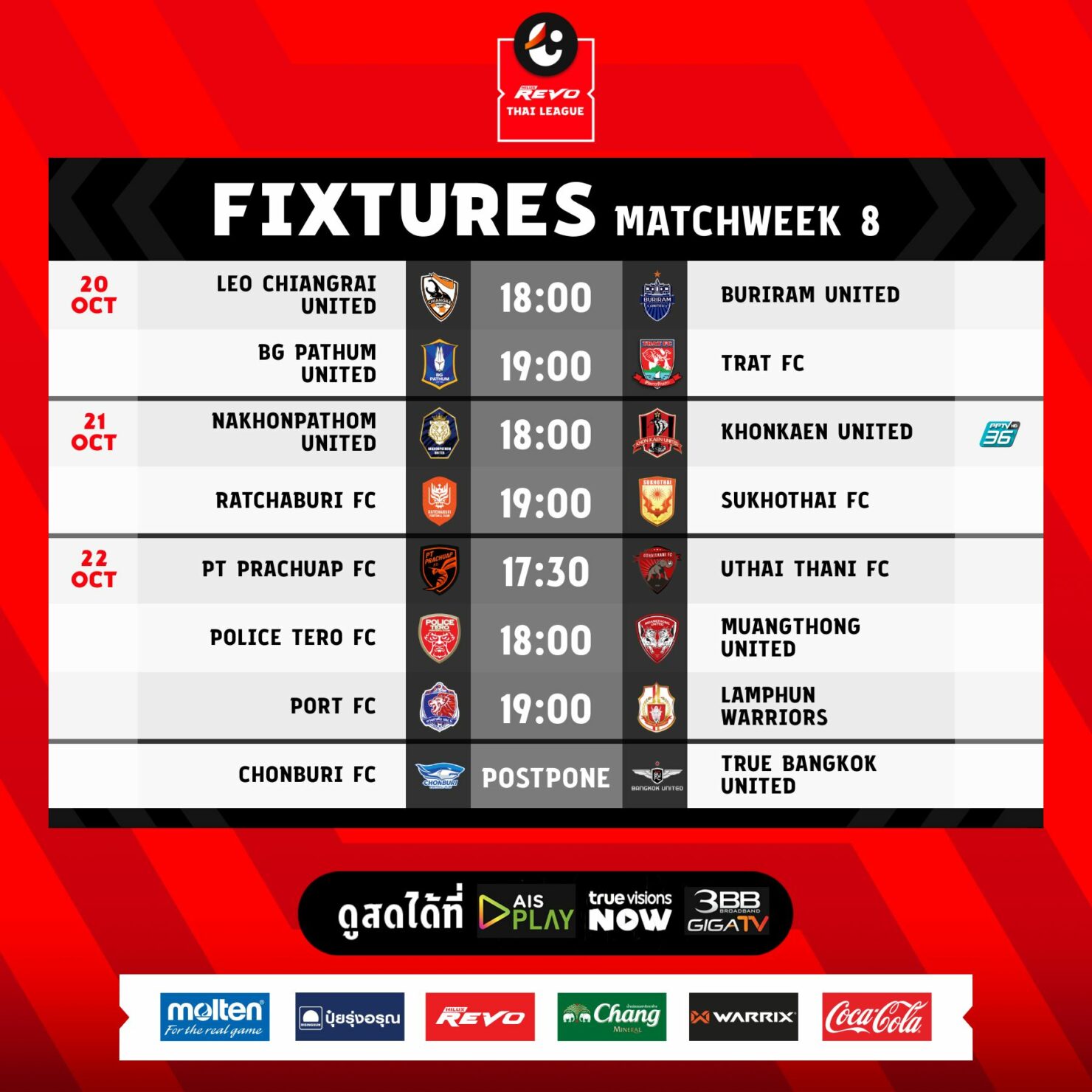 - 18:00 นครปฐม ยูไนเต็ด พบ ขอนแก่น ยูไนเต็ด PPTV
