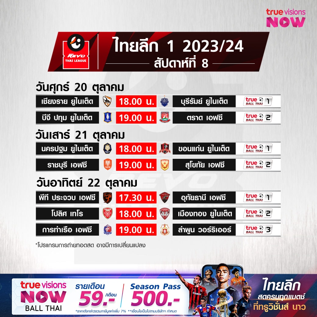 ตารางแข่งขัน รีโว่ 2023/24 ไทยลีก โปรแกรมฟุตบอลไทยลีก สัปดาห์ที่ 8 ทุกคู่ถ่ายทอดสดทาง AIS Play และ True Ball Thai