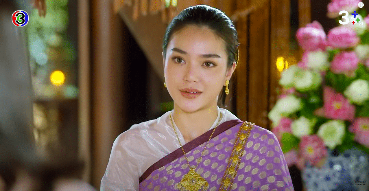ขณะเดียวกันท้าวทองกีบม้าผู้ปฏิเสธตำแหน่งพระสนม ก็มาในชุดสไบสีม่วงอ่อน ประดับประดาด้วยสร้อยทองเส้นโตและต่างหูทรงกลม แม้การแต่งตัวของเธอดูเหมือนจะไม่มีอะไร แต่ความเรียบง่ายกลับทำให้ลุคคลีน ๆ ดูโดดเด่นได้อย่างไม่น่าเชื่อ