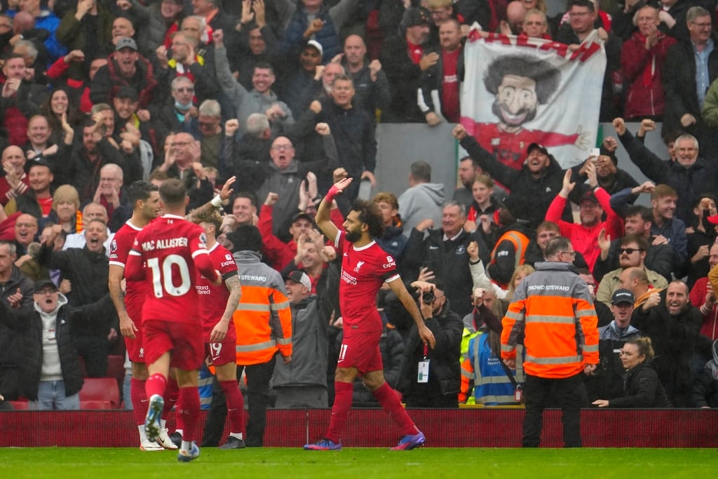 Liverpool players celebrate after Liverpool’s Mohamed Salah, centre, scored his side’s second goal during the English Premier League soccer match between Liverpool and Everton, at Anfield in Liverpool, England, Saturday, Oct. 21, 2023. (AP Photo/Jon Super)