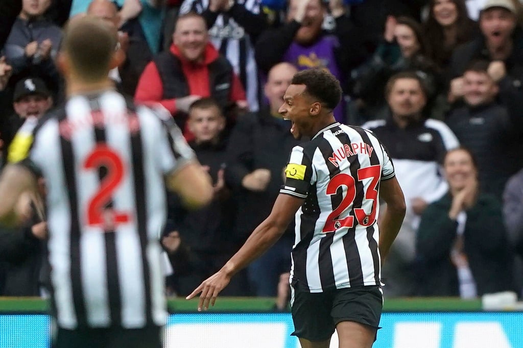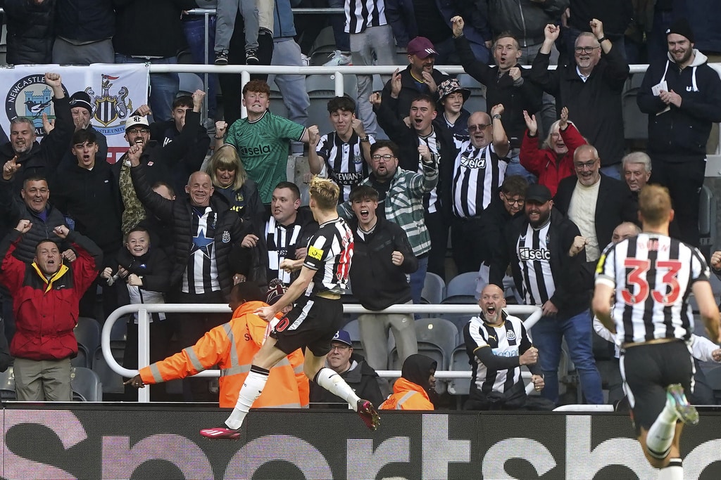 Newcastle United’s Jacob Murphy, right, celebrates scoring during the English Premier League soccer match between Newcastle United and Crystal Palace at St James’ Park, Newcastle upon Tyne, England, Saturday Oct. 21, 2023. (Owen Humphreys/PA via AP)
