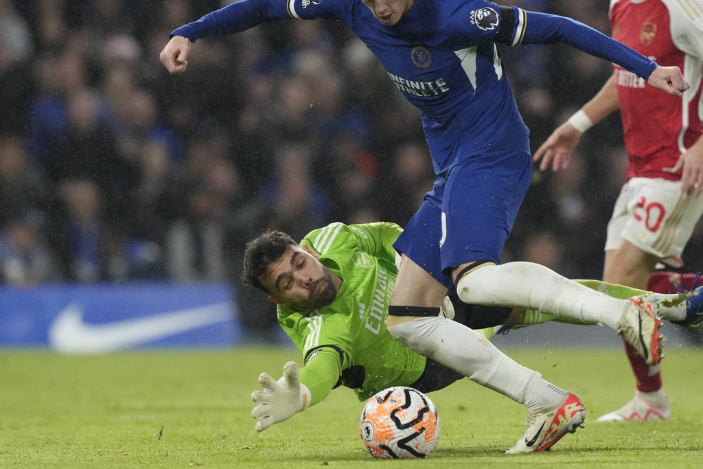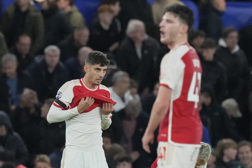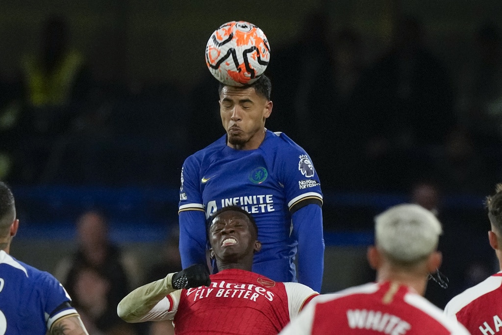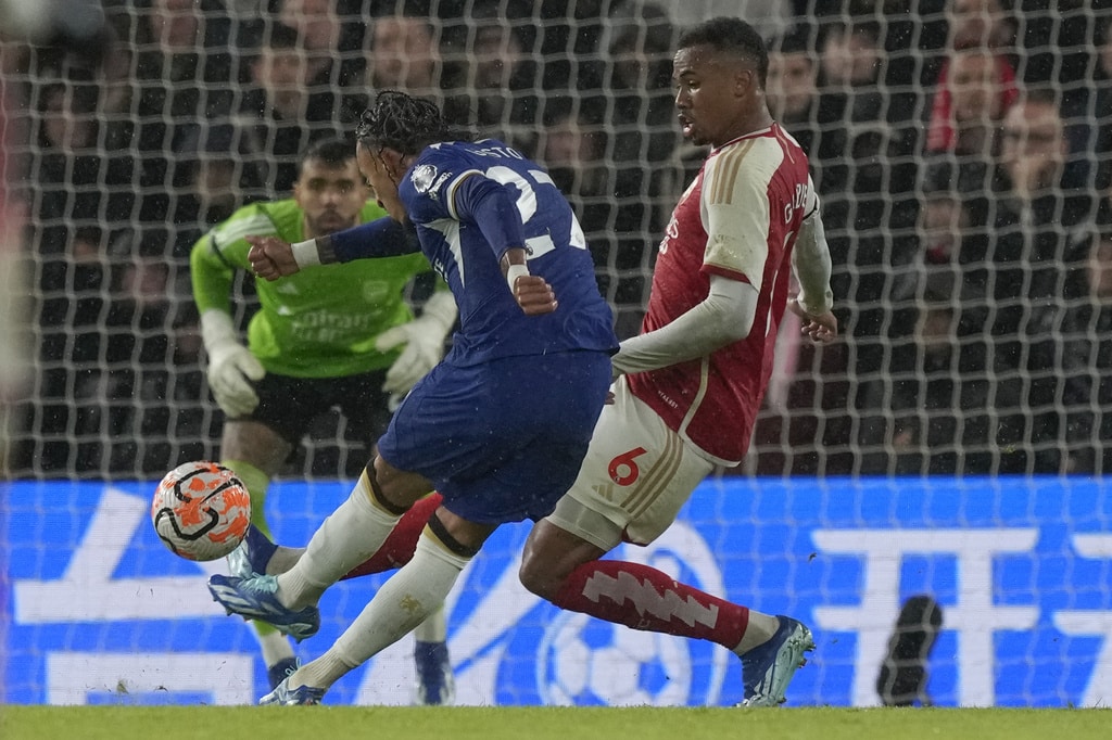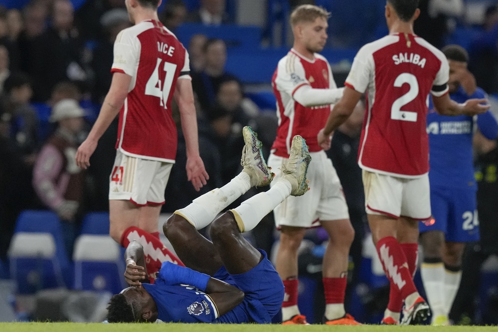 Chelsea’s Raheem Sterling, left, is challenged by Arsenal’s William Saliba during the English Premier League soccer match between Chelsea and Arsenal at Stamford Bridge stadium in London, England, Saturday, Oct. 21, 2023. (AP Photo/Frank Augstein)Arsenal’s teammates Kai Havertz, left, and Declan Rice react at the end of a English Premier League soccer match between Chelsea and Arsenal at Stamford Bridge stadium in London, England, Saturday, Oct. 21, 2023. The game ended in a 2-2 tie. (AP Photo/Frank Augstein)Chelsea’s Nicolas Jackson lies on the pitch at the end of a English Premier League soccer match between Chelsea and Arsenal at Stamford Bridge stadium in London, England, Saturday, Oct. 21, 2023. The game ended in a 2-2 tie. (AP Photo/Frank Augstein)Arsenal’s Declan Rice reacts during the English Premier League soccer match between Chelsea and Arsenal at Stamford Bridge stadium in London, England, Saturday, Oct. 21, 2023. (AP Photo/Frank Augstein)Chelsea’s Reece James, right, greets teammate Levi Colwill at the end of a English Premier League soccer match between Chelsea and Arsenal at Stamford Bridge stadium in London, England, Saturday, Oct. 21, 2023. The game ended in a 2-2 tie. (AP Photo/Frank Augstein)Chelsea’s Levi Colwill, top, and Arsenal’s Eddie Nketiah jump for a header during the English Premier League soccer match between Chelsea and Arsenal at Stamford Bridge stadium in London, England, Saturday, Oct. 21, 2023. (AP Photo/Frank Augstein)Arsenal’s Leandro Trossard, second from right, celebrates after scoring his side’s 2nd goal during the English Premier League soccer match between Chelsea and Arsenal at Stamford Bridge stadium in London, England, Saturday, Oct. 21, 2023. (AP Photo/Frank Augstein)Arsenal’s Leandro Trossard, left, celebrates after scoring his side’s 2nd goal during the English Premier League soccer match between Chelsea and Arsenal at Stamford Bridge stadium in London, England, Saturday, Oct. 21, 2023. (AP Photo/Frank Augstein)Chelsea’s Enzo Fernandez, left, and Arsenal’s Bukayo Saka battle for the ball during the English Premier League soccer match between Chelsea and Arsenal at Stamford Bridge stadium in London, England, Saturday, Oct. 21, 2023. (AP Photo/Frank Augstein)Arsenal’s Declan Rice celebrates after scoring his side’s first goal during the English Premier League soccer match between Chelsea and Arsenal at Stamford Bridge stadium in London, England, Saturday, Oct. 21, 2023. (AP Photo/Frank Augstein)Arsenal’s Declan Rice celebrates after scoring his side’s first goal during the English Premier League soccer match between Chelsea and Arsenal at Stamford Bridge stadium in London, England, Saturday, Oct. 21, 2023. (AP Photo/Frank Augstein)Chelsea’s Cole Palmer goes with the ball past Arsenal’s goalkeeper David Raya in an unsuccessful attempt to score during the English Premier League soccer match between Chelsea and Arsenal at Stamford Bridge stadium in London, England, Saturday, Oct. 21, 2023. (AP Photo/Frank Augstein)Chelsea’s Mykhailo Mudryk, center, celebrates with teammates after scoring his side’s 2nd goal during the English Premier League soccer match between Chelsea and Arsenal at Stamford Bridge stadium in London, England, Saturday, Oct. 21, 2023. (AP Photo/Frank Augstein)Chelsea’s Mykhailo Mudryk celebrates after scoring his side’s 2nd goal during the English Premier League soccer match between Chelsea and Arsenal at Stamford Bridge stadium in London, England, Saturday, Oct. 21, 2023. (AP Photo/Frank Augstein)Chelsea’s Raheem Sterling looks on during the English Premier League soccer match between Chelsea and Arsenal at Stamford Bridge stadium in London, England, Saturday, Oct. 21, 2023. (AP Photo/Frank Augstein)Chelsea’s Raheem Sterling, right, escapes with the ball from Arsenal’s Oleksandr Zinchenko during the English Premier League soccer match between Chelsea and Arsenal at Stamford Bridge stadium in London, England, Saturday, Oct. 21, 2023. (AP Photo/Frank Augstein)Chelsea’s Malo Gusto kicks the ball in an attempt to score as Arsenal’s Gabriel Magalhaes, right, defends during the English Premier League soccer match between Chelsea and Arsenal at Stamford Bridge stadium in London, England, Saturday, Oct. 21, 2023. (AP Photo/Frank Augstein)