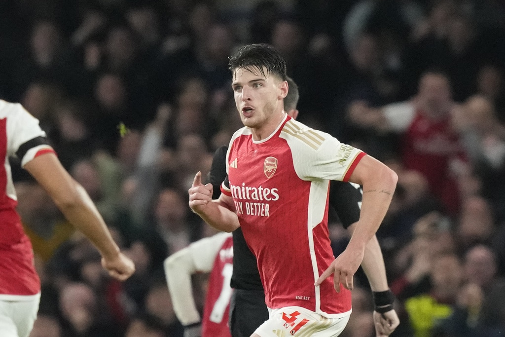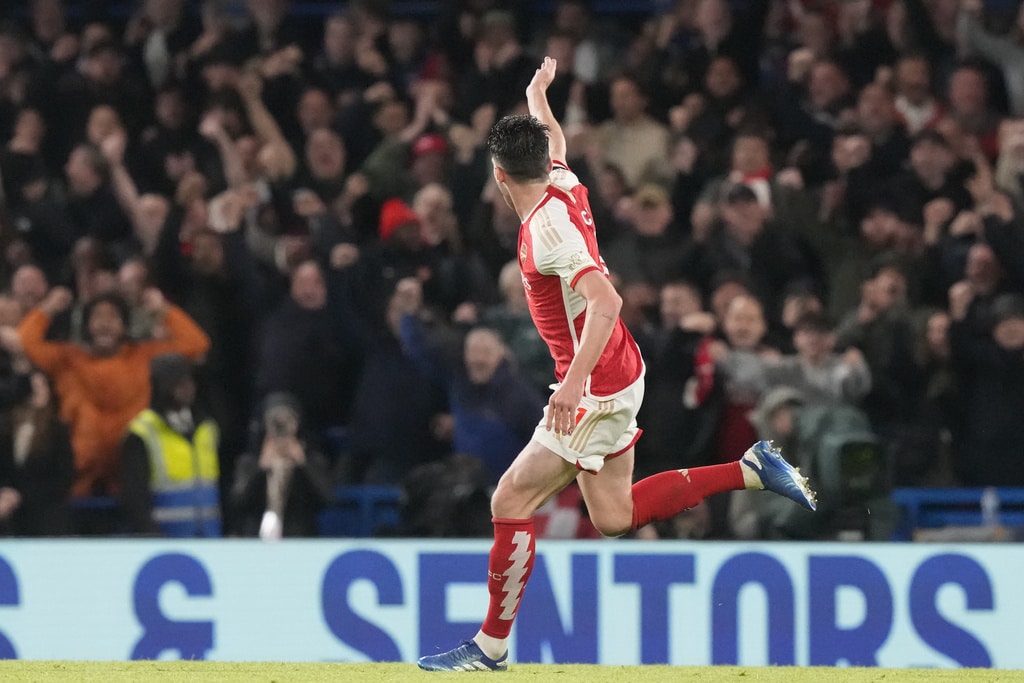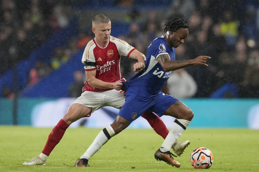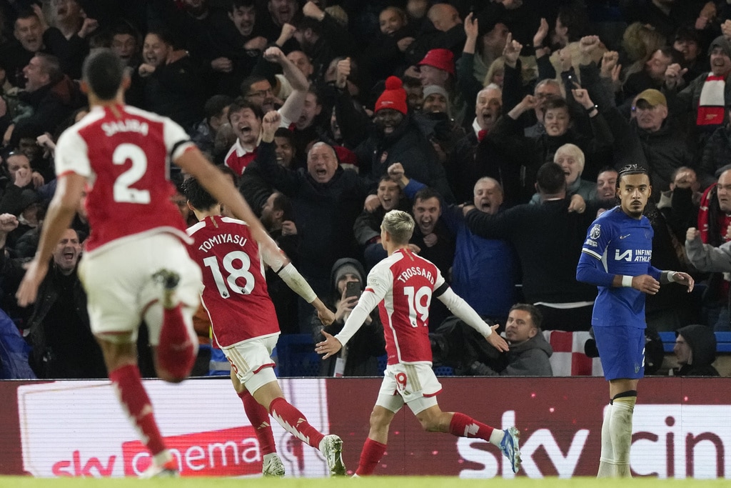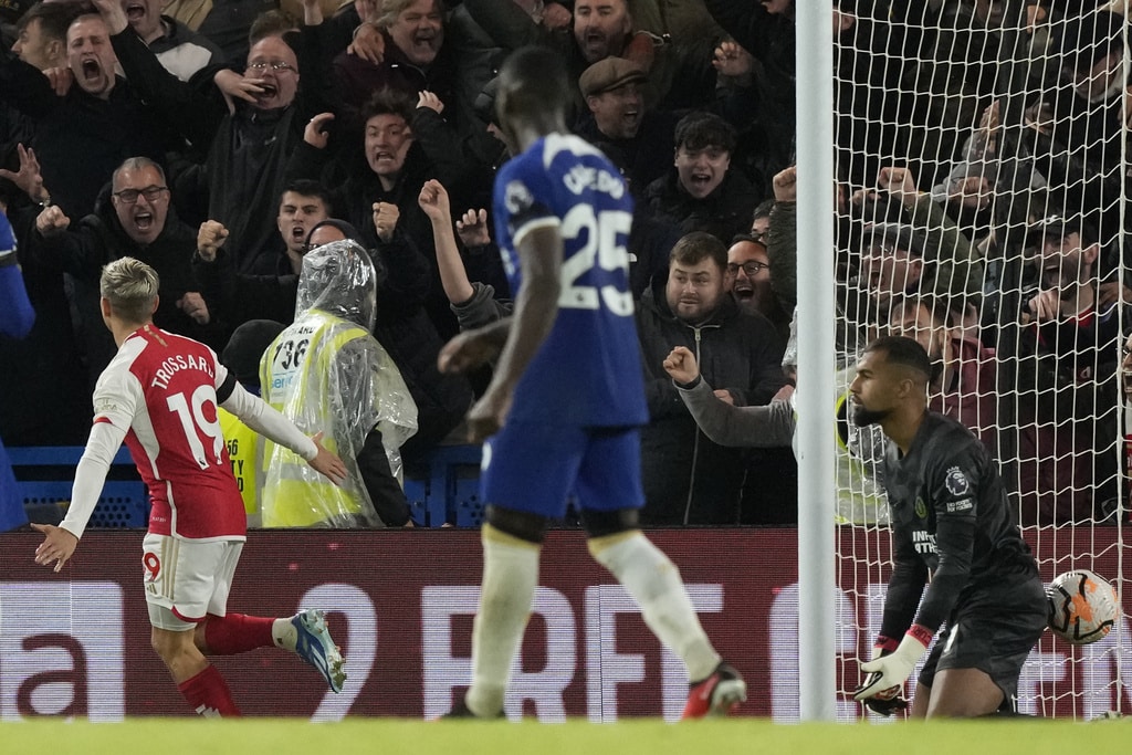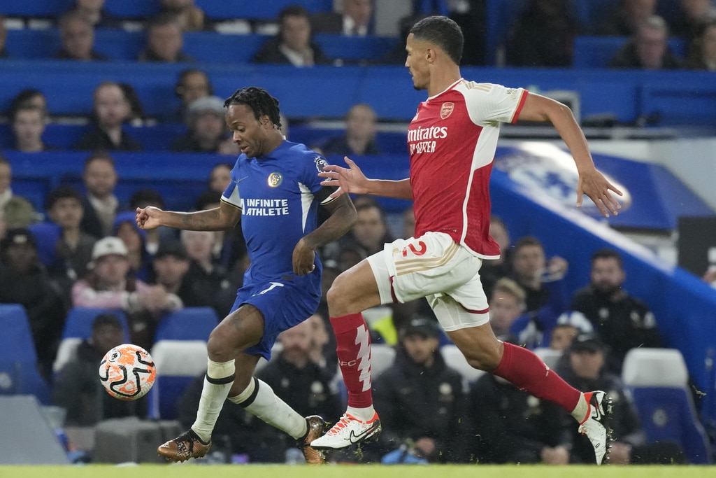 Chelsea’s Raheem Sterling, left, is challenged by Arsenal’s William Saliba during the English Premier League soccer match between Chelsea and Arsenal at Stamford Bridge stadium in London, England, Saturday, Oct. 21, 2023. (AP Photo/Frank Augstein)Arsenal’s teammates Kai Havertz, left, and Declan Rice react at the end of a English Premier League soccer match between Chelsea and Arsenal at Stamford Bridge stadium in London, England, Saturday, Oct. 21, 2023. The game ended in a 2-2 tie. (AP Photo/Frank Augstein)Chelsea’s Nicolas Jackson lies on the pitch at the end of a English Premier League soccer match between Chelsea and Arsenal at Stamford Bridge stadium in London, England, Saturday, Oct. 21, 2023. The game ended in a 2-2 tie. (AP Photo/Frank Augstein)Arsenal’s Declan Rice reacts during the English Premier League soccer match between Chelsea and Arsenal at Stamford Bridge stadium in London, England, Saturday, Oct. 21, 2023. (AP Photo/Frank Augstein)Chelsea’s Reece James, right, greets teammate Levi Colwill at the end of a English Premier League soccer match between Chelsea and Arsenal at Stamford Bridge stadium in London, England, Saturday, Oct. 21, 2023. The game ended in a 2-2 tie. (AP Photo/Frank Augstein)Chelsea’s Levi Colwill, top, and Arsenal’s Eddie Nketiah jump for a header during the English Premier League soccer match between Chelsea and Arsenal at Stamford Bridge stadium in London, England, Saturday, Oct. 21, 2023. (AP Photo/Frank Augstein)Arsenal’s Leandro Trossard, second from right, celebrates after scoring his side’s 2nd goal during the English Premier League soccer match between Chelsea and Arsenal at Stamford Bridge stadium in London, England, Saturday, Oct. 21, 2023. (AP Photo/Frank Augstein)Arsenal’s Leandro Trossard, left, celebrates after scoring his side’s 2nd goal during the English Premier League soccer match between Chelsea and Arsenal at Stamford Bridge stadium in London, England, Saturday, Oct. 21, 2023. (AP Photo/Frank Augstein)Chelsea’s Enzo Fernandez, left, and Arsenal’s Bukayo Saka battle for the ball during the English Premier League soccer match between Chelsea and Arsenal at Stamford Bridge stadium in London, England, Saturday, Oct. 21, 2023. (AP Photo/Frank Augstein)Arsenal’s Declan Rice celebrates after scoring his side’s first goal during the English Premier League soccer match between Chelsea and Arsenal at Stamford Bridge stadium in London, England, Saturday, Oct. 21, 2023. (AP Photo/Frank Augstein)Arsenal’s Declan Rice celebrates after scoring his side’s first goal during the English Premier League soccer match between Chelsea and Arsenal at Stamford Bridge stadium in London, England, Saturday, Oct. 21, 2023. (AP Photo/Frank Augstein)Chelsea’s Cole Palmer goes with the ball past Arsenal’s goalkeeper David Raya in an unsuccessful attempt to score during the English Premier League soccer match between Chelsea and Arsenal at Stamford Bridge stadium in London, England, Saturday, Oct. 21, 2023. (AP Photo/Frank Augstein)Chelsea’s Mykhailo Mudryk, center, celebrates with teammates after scoring his side’s 2nd goal during the English Premier League soccer match between Chelsea and Arsenal at Stamford Bridge stadium in London, England, Saturday, Oct. 21, 2023. (AP Photo/Frank Augstein)Chelsea’s Mykhailo Mudryk celebrates after scoring his side’s 2nd goal during the English Premier League soccer match between Chelsea and Arsenal at Stamford Bridge stadium in London, England, Saturday, Oct. 21, 2023. (AP Photo/Frank Augstein)Chelsea’s Raheem Sterling looks on during the English Premier League soccer match between Chelsea and Arsenal at Stamford Bridge stadium in London, England, Saturday, Oct. 21, 2023. (AP Photo/Frank Augstein)Chelsea’s Raheem Sterling, right, escapes with the ball from Arsenal’s Oleksandr Zinchenko during the English Premier League soccer match between Chelsea and Arsenal at Stamford Bridge stadium in London, England, Saturday, Oct. 21, 2023. (AP Photo/Frank Augstein)Chelsea’s Malo Gusto kicks the ball in an attempt to score as Arsenal’s Gabriel Magalhaes, right, defends during the English Premier League soccer match between Chelsea and Arsenal at Stamford Bridge stadium in London, England, Saturday, Oct. 21, 2023. (AP Photo/Frank Augstein)