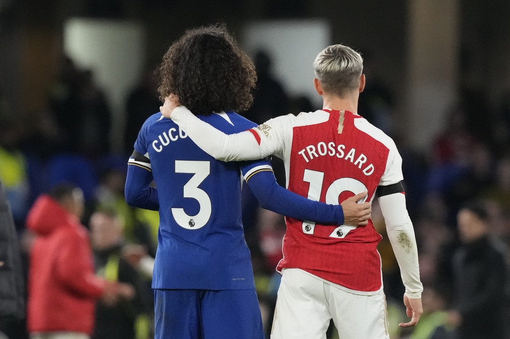Chelsea’s Marc Cucurella, left, and Arsenal’s Leandro Trossard leave the field at the end of a English Premier League soccer match between Chelsea and Arsenal at Stamford Bridge stadium in London, England, Saturday, Oct. 21, 2023. The game ended in a 2-2 tie. (AP Photo/Frank Augstein)