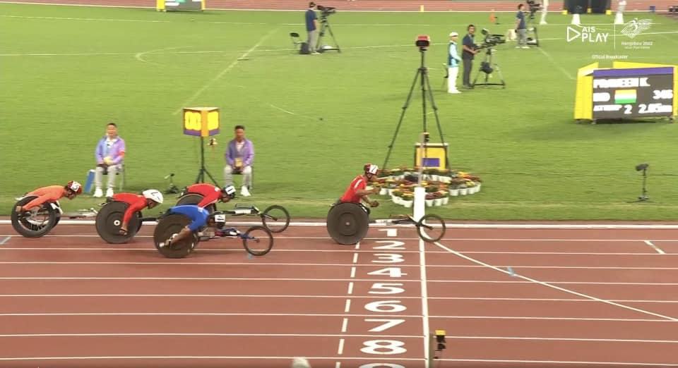 ”ประวัติ วะโฮรัมย์” ยังแกร่งป้องกันแชมป์วีลแชร์เรซซิ่ง 5,000 ม. T54 เอาไว้อีกสมัย ในการแข่งขันกรีฑา เอเชียนพาราเกมส์ ครั้งที่ 4 ที่ สนามหวงหลง สปอร์ต เซนเตอร์ เมืองหางโจว ประเทศจีน เมื่อวันที่ 23 ตุลาคม 2566