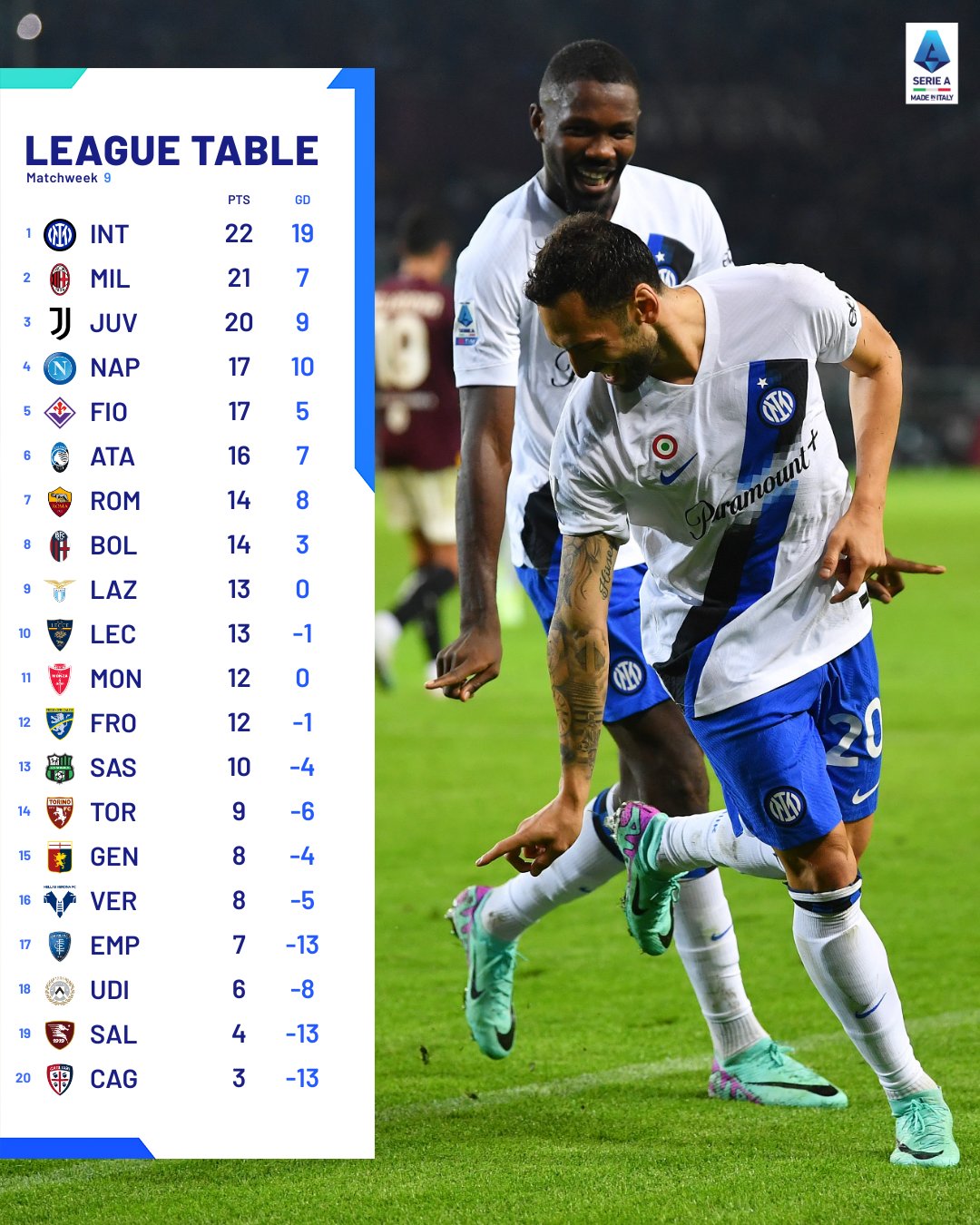 สรุปผลการแข่งขัน กัลโช่ เซเรียอา 2023/24 หลังจบนัดที่ 9