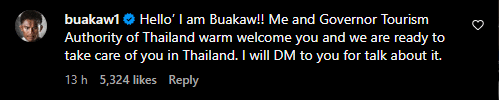 และล่าสุด มีแฟนกีฬาตาดีไปเห็นว่า บัวขาว บัญชาเมฆ ยอดนักชกชาวไทยได้เข้าไปคอมเมนต์ในโพสต์ดังกล่าวว่า “สวัสดีผมชื่อบัวขาว ผมและกระทรวงการท่องเที่ยวของไทย ได้คุยกันว่าเรายินดีต้อนรับคุณและจะดูแลคุณอย่างดีหากคุณมาที่นี่ รายละเอียดทั้งหมดผมจะทักในไดเร็คแมสเซจไปนะ”