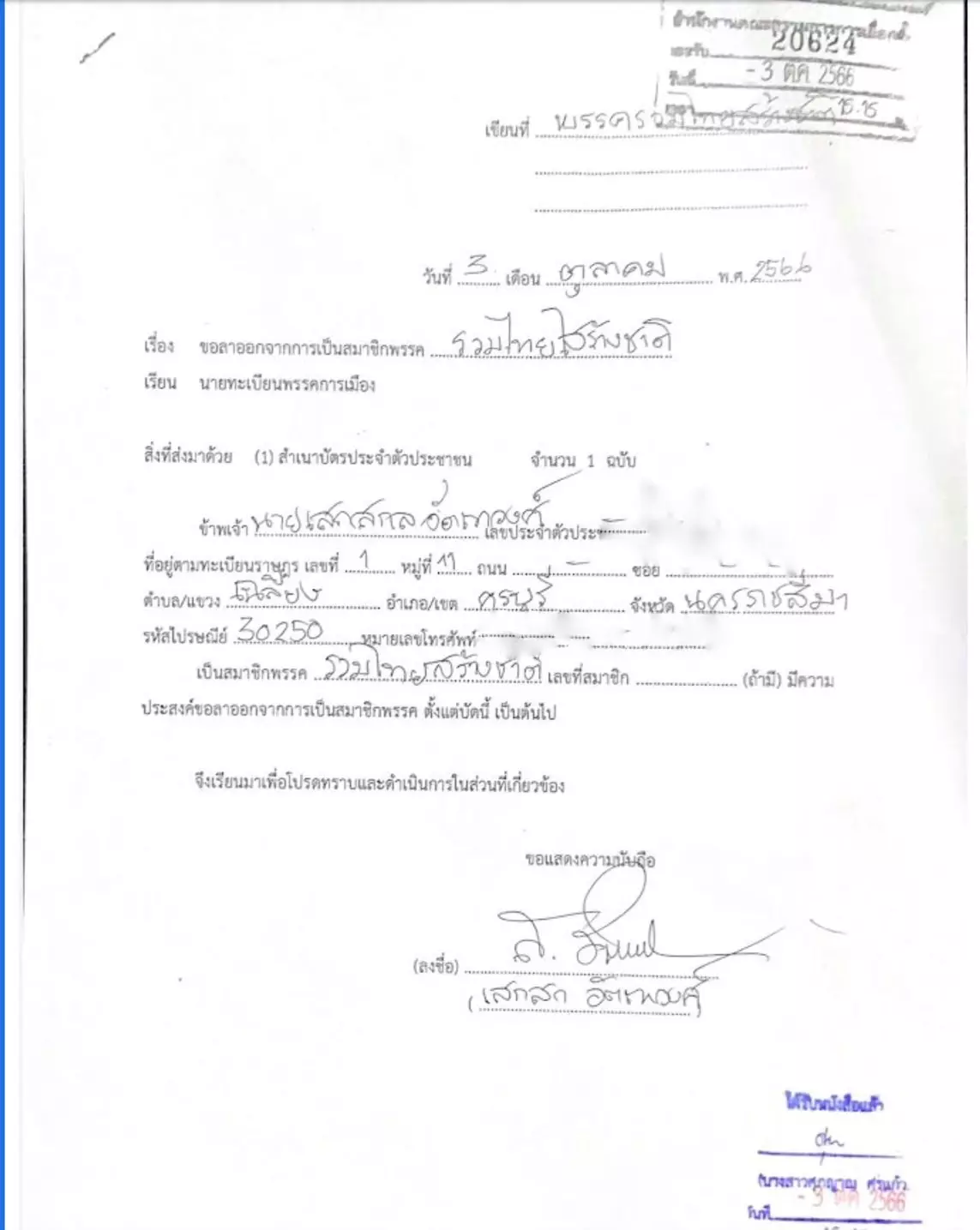 นาย เสกสกล อัตถาวงศ์ หรือ แรมโบ้อีสาน รองหัวหน้าพรรค และผู้สมัครสมาชิกสภาผู้แทนราษฎร (สส.) แบบบัญชีรายชื่อ พรรครวมไทยสร้างชาติ (รทสช.) และในฐานะที่ปรึกษารองนายกรัฐมนตรี นายพีระพันธุ์ สาลีรัฐวิภาค ยื่นหนังสือลาออกจากพรรครวมไทยสร้างชาติ ต่อนายทะเบียนพรรคการเมือง คณะกรรมการการเลือกตั้ง (กกต.) โดยยื่นลาออกตั้งแต่วันที่ 3 ตุลาคม ที่ผ่านมา