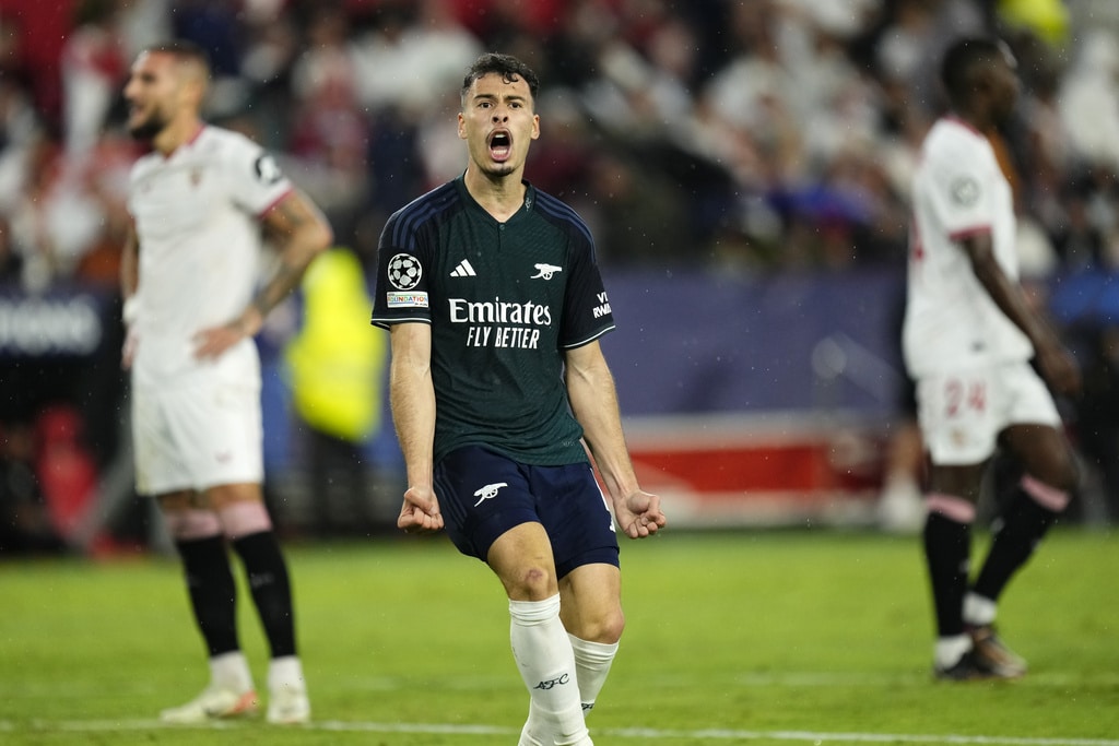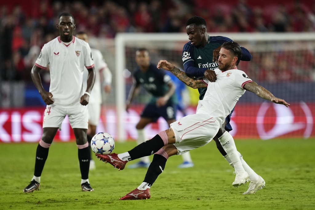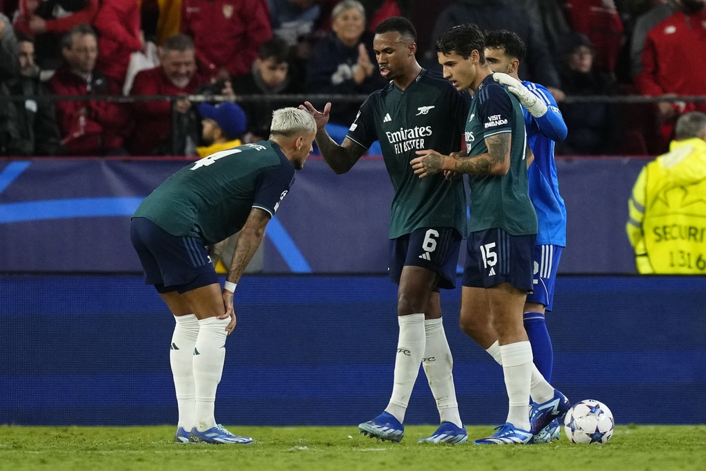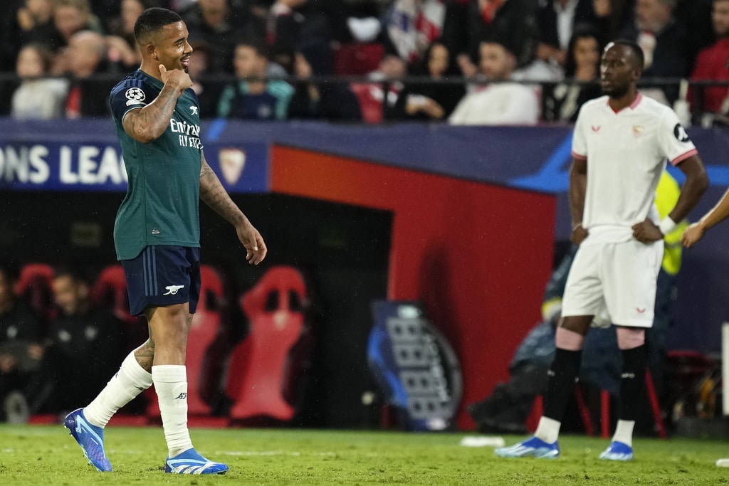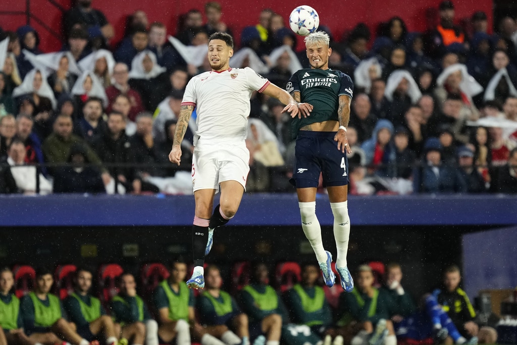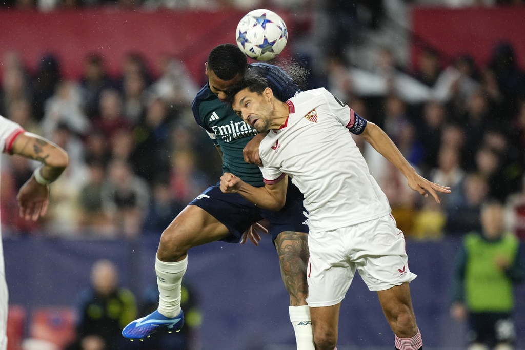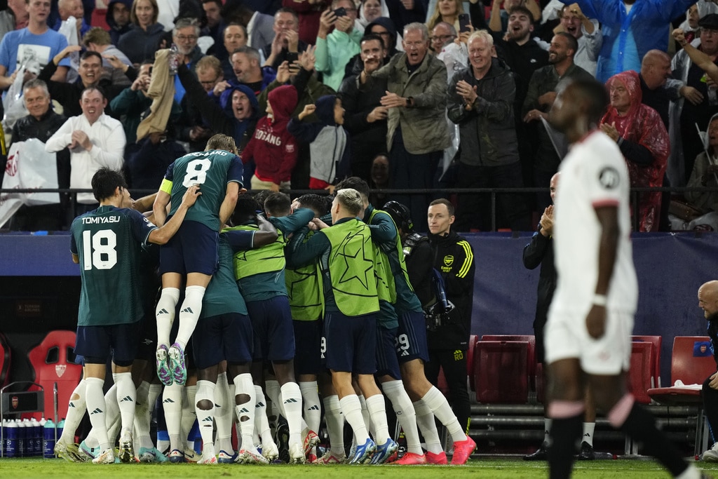 Arsenal’s Gabriel Martinelli celebrates after scoring his sides first goal during the Champions League Group B soccer match between Sevilla and Arsenal at the Ramon Sanchez-Pizjuan stadium in Seville, Spain, Tuesday Oct. 24, 2023. (AP Photo/Jose Breton)Players of rasenal react after the Champions League Group B soccer match between Sevilla and Arsenal at the Ramon Sanchez-Pizjuan stadium in Seville, Spain, Tuesday Oct. 24, 2023. (AP Photo/Jose Breton)Manchester United’s Rasmus Hojlund, center, kicks the ball during the Champions League group A soccer match between Manchester United and Copenhagen at the Old Trafford stadium in Manchester, England, Tuesday, Oct. 24, 2023. (AP Photo/Dave Thompson)Arsenal’s manager Mikel Arteta, center, Arsenal’s Jorginho, right, and Arsenal’s Declan Rice react after the Champions League Group B soccer match between Sevilla and Arsenal at the Ramon Sanchez-Pizjuan stadium in Seville, Spain, Tuesday Oct. 24, 2023. (AP Photo/Jose Breton)Arsenal’s manager Mikel Arteta hugs with Arsenal’s Jorginho after the Champions League Group B soccer match between Sevilla and Arsenal at the Ramon Sanchez-Pizjuan stadium in Seville, Spain, Tuesday Oct. 24, 2023. (AP Photo/Jose Breton)Arsenal’s Eddie Nketiah, back, challenges Sevilla’s Sergio Ramos during the Champions League Group B soccer match between Sevilla and Arsenal at the Ramon Sanchez-Pizjuan stadium in Seville, Spain, Tuesday Oct. 24, 2023. (AP Photo/Jose Breton)Sevilla’s Nemanja Gudelj, right, challenges Arsenal’s Bukayo Saka during the Champions League Group B soccer match between Sevilla and Arsenal at the Ramon Sanchez-Pizjuan stadium in Seville, Spain, Tuesday Oct. 24, 2023. (AP Photo/Jose Breton)Arsenal’s Ben White, right, watches as Sevilla’s Lucas Ocampos takes a shot during the Champions League Group B soccer match between Sevilla and Arsenal at the Ramon Sanchez-Pizjuan stadium in Seville, Spain, Tuesday Oct. 24, 2023. (AP Photo/Jose Breton)Sevilla’s Boubakary Soumare, left, challenges Arsenal’s Declan Rice during the Champions League Group B soccer match between Sevilla and Arsenal at the Ramon Sanchez-Pizjuan stadium in Seville, Spain, Tuesday Oct. 24, 2023. (AP Photo/Jose Breton)Sevilla’s Nemanja Gudelj celebrates after scoring his sides first goal during the Champions League Group B soccer match between Sevilla and Arsenal at the Ramon Sanchez-Pizjuan stadium in Seville, Spain, Tuesday Oct. 24, 2023. (AP Photo/Jose Breton)Sevilla’s Nemanja Gudelj celebrates after scoring his sides first goal during the Champions League Group B soccer match between Sevilla and Arsenal at the Ramon Sanchez-Pizjuan stadium in Seville, Spain, Tuesday Oct. 24, 2023. (AP Photo/Jose Breton)Sevilla’s Jesus Navas, right, challenges Arsenal’s Gabriel Jesus during the Champions League Group B soccer match between Sevilla and Arsenal at the Ramon Sanchez-Pizjuan stadium in Seville, Spain, Tuesday Oct. 24, 2023. (AP Photo/Jose Breton)Arsenal’s Gabriel Jesus celebrates after scoring his sides second goal during the Champions League Group B soccer match between Sevilla and Arsenal at the Ramon Sanchez-Pizjuan stadium in Seville, Spain, Tuesday Oct. 24, 2023. (AP Photo/Jose Breton)Arsenal’s Gabriel Jesus celebrates with teammates after scoring his sides second goal during the Champions League Group B soccer match between Sevilla and Arsenal at the Ramon Sanchez-Pizjuan stadium in Seville, Spain, Tuesday Oct. 24, 2023. (AP Photo/Jose Breton)Sevilla’s Sergio Ramos, left, chases Arsenal’s Gabriel Martinelli during the Champions League Group B soccer match between Sevilla and Arsenal at the Ramon Sanchez-Pizjuan stadium in Seville, Spain, Tuesday Oct. 24, 2023. (AP Photo/Jose Breton)Sevilla’s Lucas Ocampos, left, challenges Arsenal’s Ben White during the Champions League Group B soccer match between Sevilla and Arsenal at the Ramon Sanchez-Pizjuan stadium in Seville, Spain, Tuesday Oct. 24, 2023. (AP Photo/Jose Breton)Arsenal’s Martin Odegaard takes as shot during the Champions League Group B soccer match between Sevilla and Arsenal at the Ramon Sanchez-Pizjuan stadium in Seville, Spain, Tuesday Oct. 24, 2023. (AP Photo/Jose Breton)Arsenal’s Gabriel Martinelli, left, runs past Sevilla’s goalkeeper Orjan Nyland to score his sides first goal during the Champions League Group B soccer match between Sevilla and Arsenal at the Ramon Sanchez-Pizjuan stadium in Seville, Spain, Tuesday Oct. 24, 2023. (AP Photo/Jose Breton)