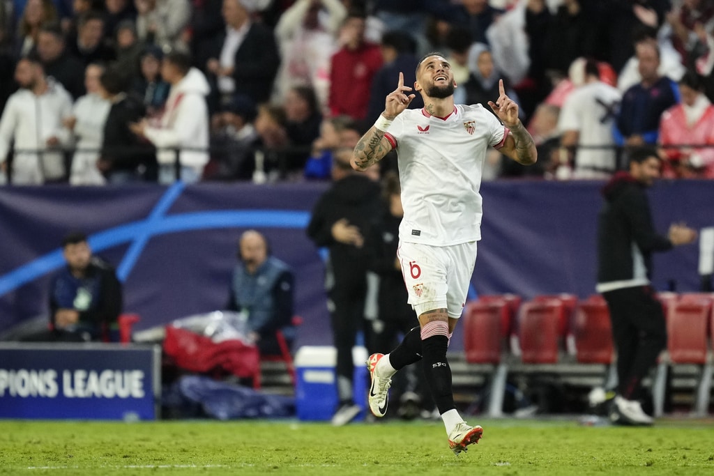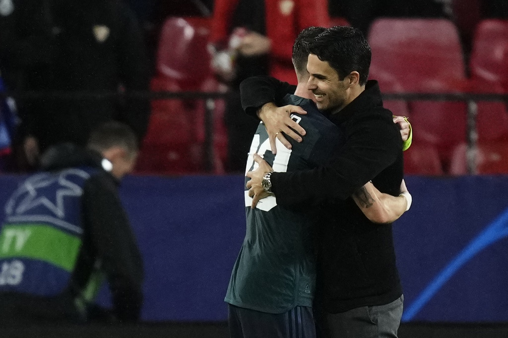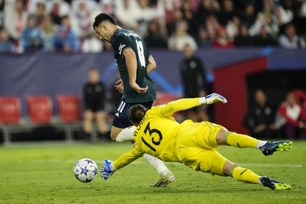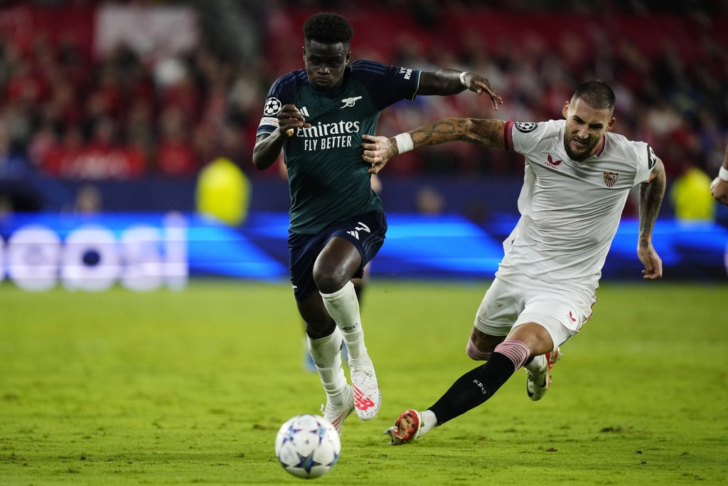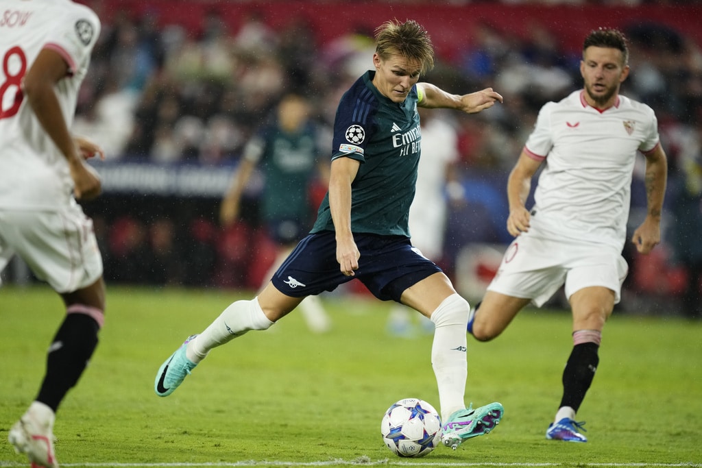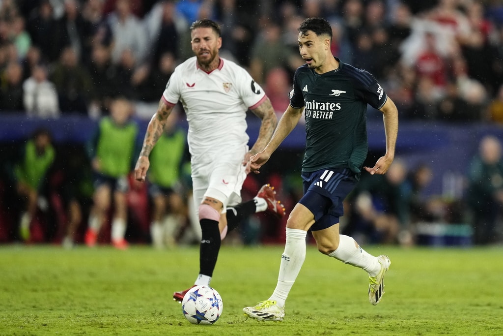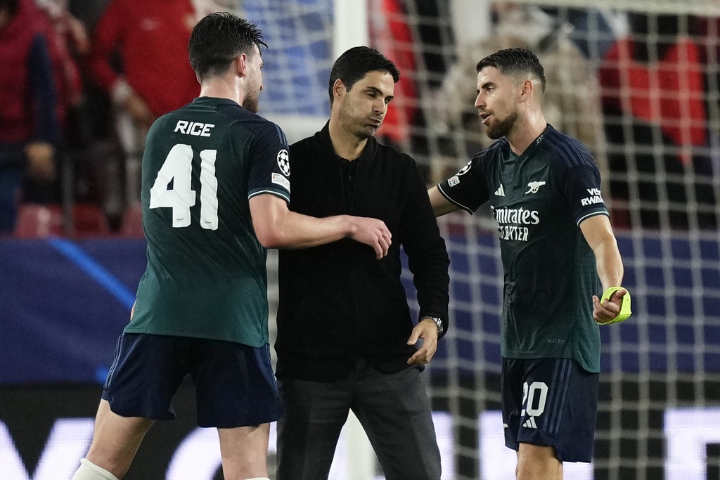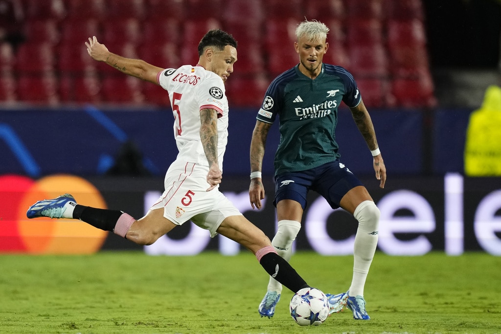 Arsenal’s Gabriel Martinelli celebrates after scoring his sides first goal during the Champions League Group B soccer match between Sevilla and Arsenal at the Ramon Sanchez-Pizjuan stadium in Seville, Spain, Tuesday Oct. 24, 2023. (AP Photo/Jose Breton)Players of rasenal react after the Champions League Group B soccer match between Sevilla and Arsenal at the Ramon Sanchez-Pizjuan stadium in Seville, Spain, Tuesday Oct. 24, 2023. (AP Photo/Jose Breton)Manchester United’s Rasmus Hojlund, center, kicks the ball during the Champions League group A soccer match between Manchester United and Copenhagen at the Old Trafford stadium in Manchester, England, Tuesday, Oct. 24, 2023. (AP Photo/Dave Thompson)Arsenal’s manager Mikel Arteta, center, Arsenal’s Jorginho, right, and Arsenal’s Declan Rice react after the Champions League Group B soccer match between Sevilla and Arsenal at the Ramon Sanchez-Pizjuan stadium in Seville, Spain, Tuesday Oct. 24, 2023. (AP Photo/Jose Breton)Arsenal’s manager Mikel Arteta hugs with Arsenal’s Jorginho after the Champions League Group B soccer match between Sevilla and Arsenal at the Ramon Sanchez-Pizjuan stadium in Seville, Spain, Tuesday Oct. 24, 2023. (AP Photo/Jose Breton)Arsenal’s Eddie Nketiah, back, challenges Sevilla’s Sergio Ramos during the Champions League Group B soccer match between Sevilla and Arsenal at the Ramon Sanchez-Pizjuan stadium in Seville, Spain, Tuesday Oct. 24, 2023. (AP Photo/Jose Breton)Sevilla’s Nemanja Gudelj, right, challenges Arsenal’s Bukayo Saka during the Champions League Group B soccer match between Sevilla and Arsenal at the Ramon Sanchez-Pizjuan stadium in Seville, Spain, Tuesday Oct. 24, 2023. (AP Photo/Jose Breton)Arsenal’s Ben White, right, watches as Sevilla’s Lucas Ocampos takes a shot during the Champions League Group B soccer match between Sevilla and Arsenal at the Ramon Sanchez-Pizjuan stadium in Seville, Spain, Tuesday Oct. 24, 2023. (AP Photo/Jose Breton)Sevilla’s Boubakary Soumare, left, challenges Arsenal’s Declan Rice during the Champions League Group B soccer match between Sevilla and Arsenal at the Ramon Sanchez-Pizjuan stadium in Seville, Spain, Tuesday Oct. 24, 2023. (AP Photo/Jose Breton)Sevilla’s Nemanja Gudelj celebrates after scoring his sides first goal during the Champions League Group B soccer match between Sevilla and Arsenal at the Ramon Sanchez-Pizjuan stadium in Seville, Spain, Tuesday Oct. 24, 2023. (AP Photo/Jose Breton)Sevilla’s Nemanja Gudelj celebrates after scoring his sides first goal during the Champions League Group B soccer match between Sevilla and Arsenal at the Ramon Sanchez-Pizjuan stadium in Seville, Spain, Tuesday Oct. 24, 2023. (AP Photo/Jose Breton)Sevilla’s Jesus Navas, right, challenges Arsenal’s Gabriel Jesus during the Champions League Group B soccer match between Sevilla and Arsenal at the Ramon Sanchez-Pizjuan stadium in Seville, Spain, Tuesday Oct. 24, 2023. (AP Photo/Jose Breton)Arsenal’s Gabriel Jesus celebrates after scoring his sides second goal during the Champions League Group B soccer match between Sevilla and Arsenal at the Ramon Sanchez-Pizjuan stadium in Seville, Spain, Tuesday Oct. 24, 2023. (AP Photo/Jose Breton)Arsenal’s Gabriel Jesus celebrates with teammates after scoring his sides second goal during the Champions League Group B soccer match between Sevilla and Arsenal at the Ramon Sanchez-Pizjuan stadium in Seville, Spain, Tuesday Oct. 24, 2023. (AP Photo/Jose Breton)Sevilla’s Sergio Ramos, left, chases Arsenal’s Gabriel Martinelli during the Champions League Group B soccer match between Sevilla and Arsenal at the Ramon Sanchez-Pizjuan stadium in Seville, Spain, Tuesday Oct. 24, 2023. (AP Photo/Jose Breton)Sevilla’s Lucas Ocampos, left, challenges Arsenal’s Ben White during the Champions League Group B soccer match between Sevilla and Arsenal at the Ramon Sanchez-Pizjuan stadium in Seville, Spain, Tuesday Oct. 24, 2023. (AP Photo/Jose Breton)Arsenal’s Martin Odegaard takes as shot during the Champions League Group B soccer match between Sevilla and Arsenal at the Ramon Sanchez-Pizjuan stadium in Seville, Spain, Tuesday Oct. 24, 2023. (AP Photo/Jose Breton)Arsenal’s Gabriel Martinelli, left, runs past Sevilla’s goalkeeper Orjan Nyland to score his sides first goal during the Champions League Group B soccer match between Sevilla and Arsenal at the Ramon Sanchez-Pizjuan stadium in Seville, Spain, Tuesday Oct. 24, 2023. (AP Photo/Jose Breton)