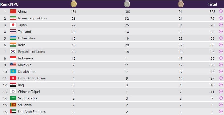โดยอันดับ 1 ยังคงเป็นเจ้าภาพอย่าง สาธารณรัฐประชาชนจีน ที่ยังผลงานดีต่อเนื่องจากเอเชียนเกมส์ ได้มาแล้ว 130 เหรียญทอง 106 เหรียญเงิน 91 เหรียญทองแดง ทิ้งห่างอันดับ 2 อย่างทีมชาติอิหร่าน ที่ได้มา 26 เหรียญทอง 32 เหรียญเงิน 20 เหรียญทองแดง และในอันดับ 3 เป็นของทีมญี่ปุ่น 22 เหรียญทอง 25 เหรียญเงิน 31 เหรียญทองแดง