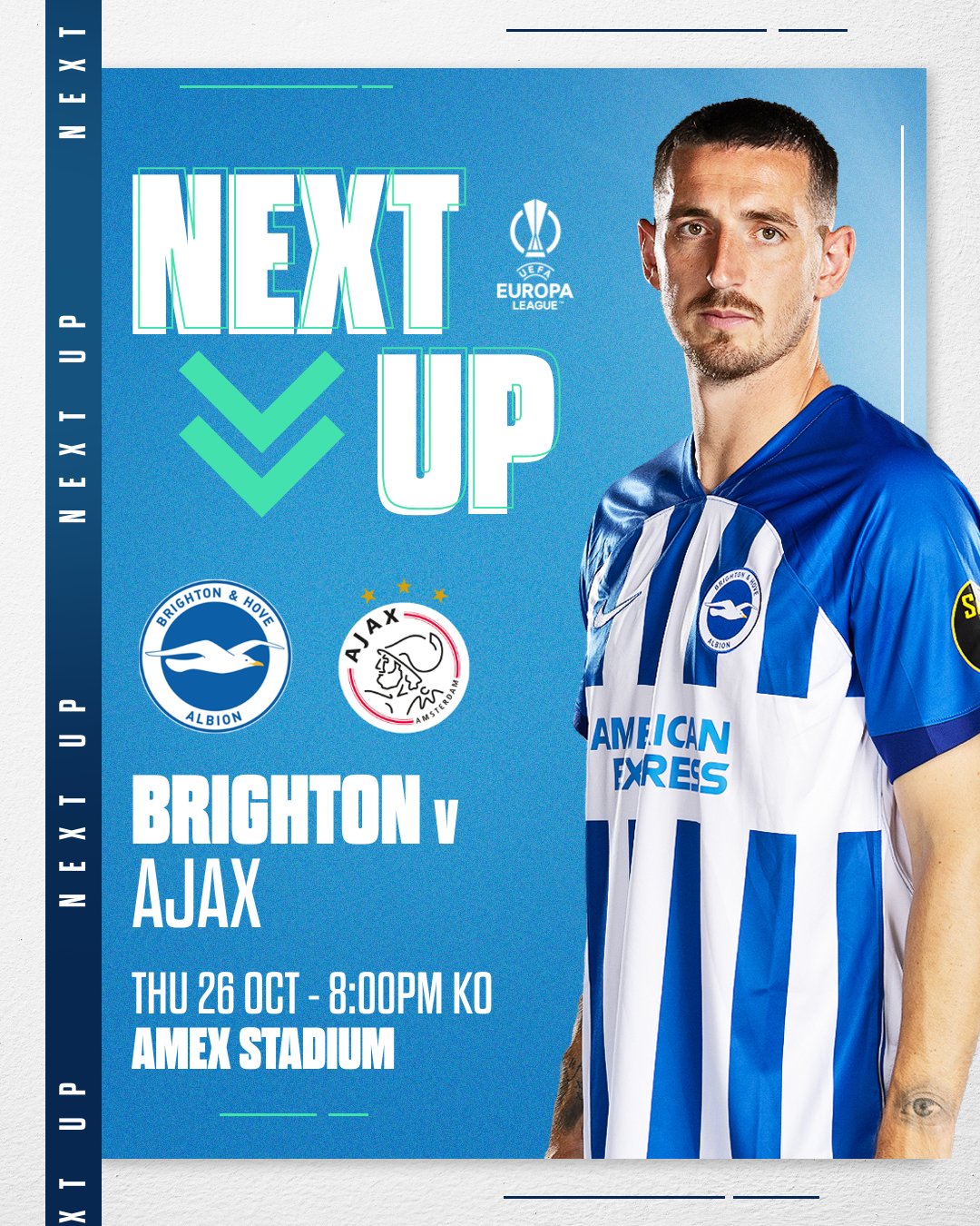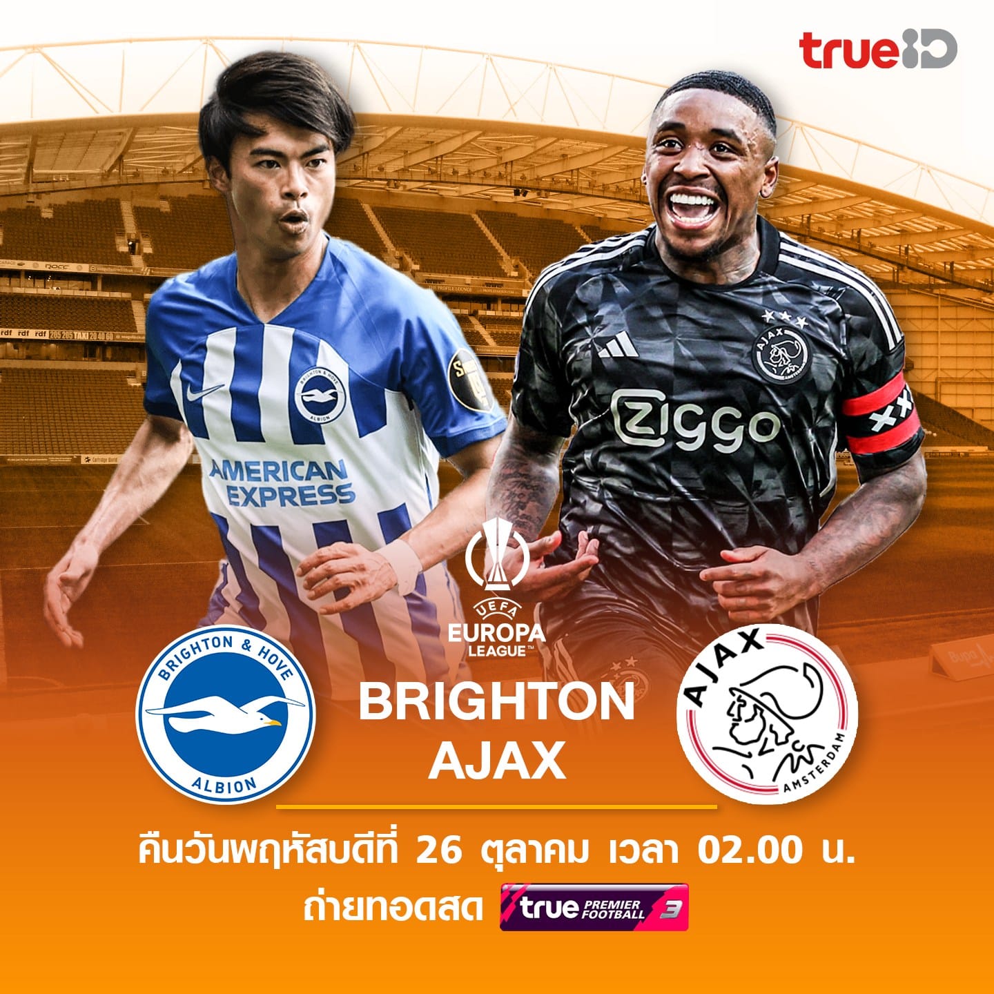 26 ตุลาคม 66 เวลา 02.00 น. ถ่ายทอดสด ดูบอลสด ฟุตบอล ยูฟ่า ยูโรป้า ลีก 2023/24 ไบรท์ตั จะลงเล่นพบกับทีมแกร่งจากฮอลแลนด์ อาแจ็กซ์ อัมส์เตอร์ดัม สามารถดูวิเคราะห์เกมพร้อมช่องทางดูบอลสด ได้ที่นี่
