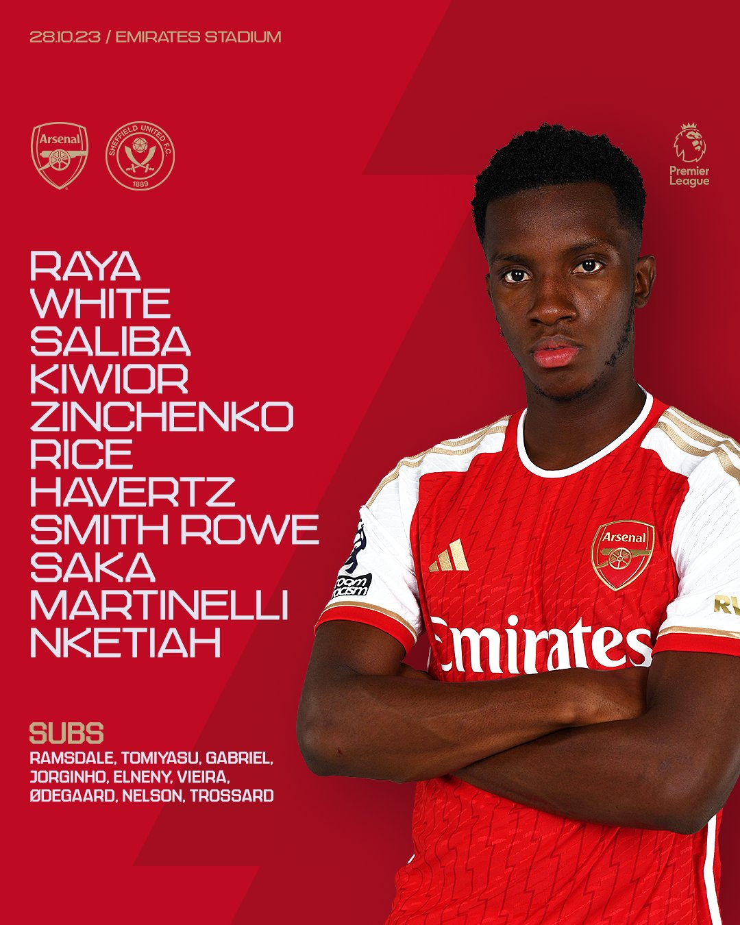 28 ตุลาคม 2566 รายชื่อผู้เล่น 11 ตัวจริง อาร์เซนอล พบ เชฟฯ ยูไนเต็ด ศึกฟุตบอลพรีเมียร์ ฤดูกาล 2023-24 คืนนี้ ลิงก์ถูกลิขสิทธิ์ ดูบอลสดออนไลน์ ทาง True Premier Football เวลา 21:00 น.