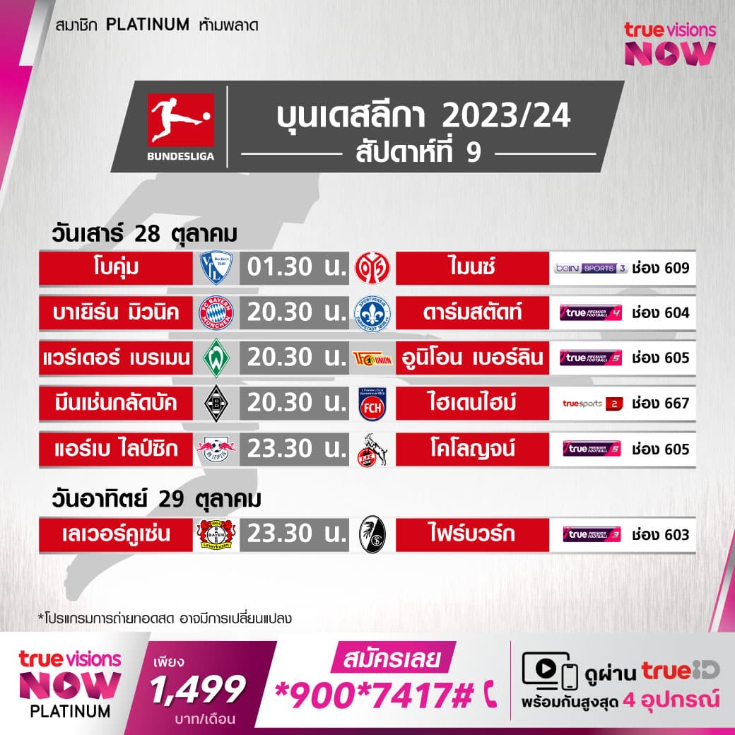 - 20:30 บาเยิร์น พบ ดาร์มสตัดท์ True Sports 4 / PPTV